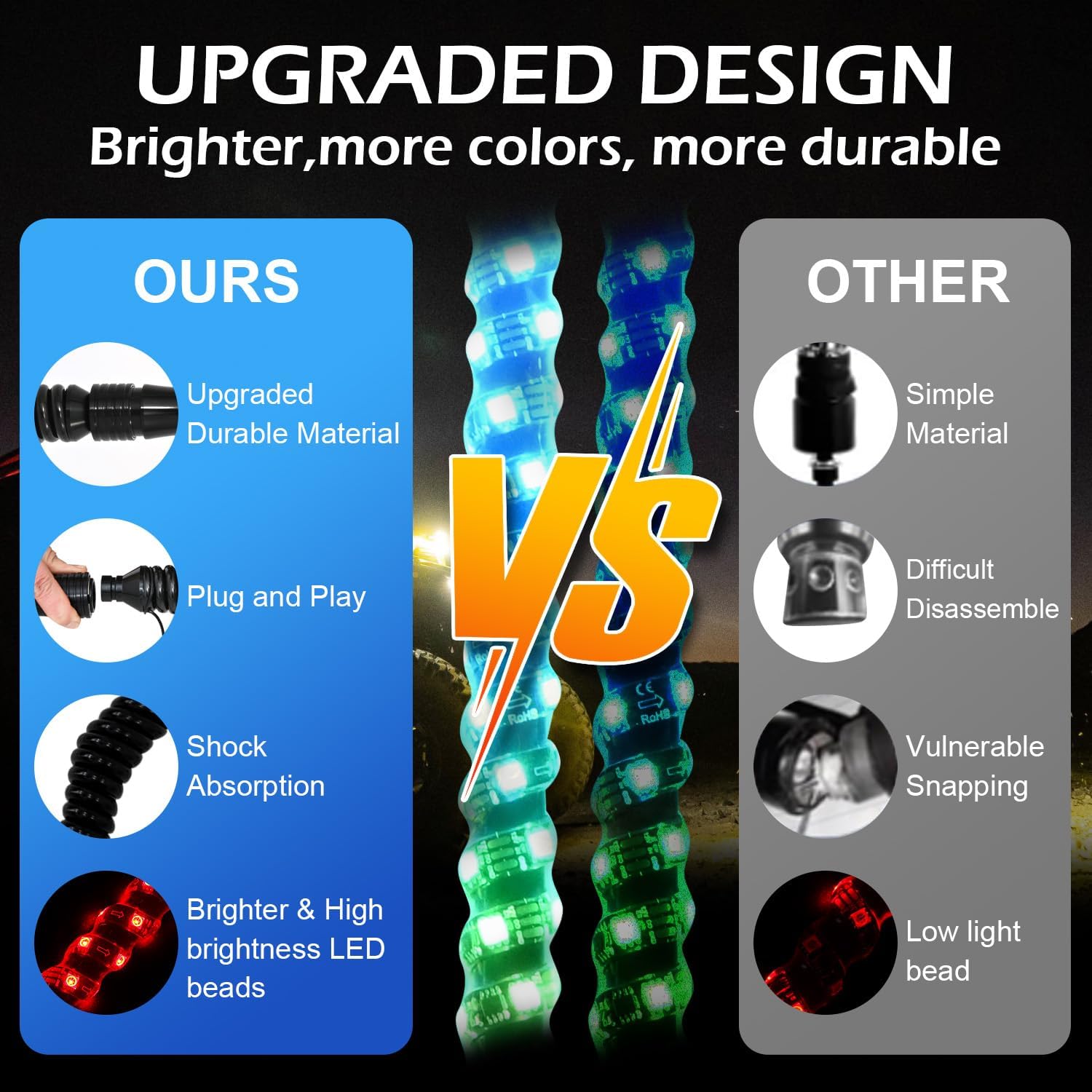 - ăUPGRADED High brightness LED beadsă: Whip Lights using the latest 5050 RGB LED chips. These LED Fat Whip Lights are three times brighter and more visible, even in daylight. Whip lights with hundreds of colors, dancing patterns, and adjustable brightness and speed settings. The tightly coiled lighted whip design ensures a 360°glow, delivering brighter, more uniform lighting. Ensure your safety on the night trail and always stand out during the ride