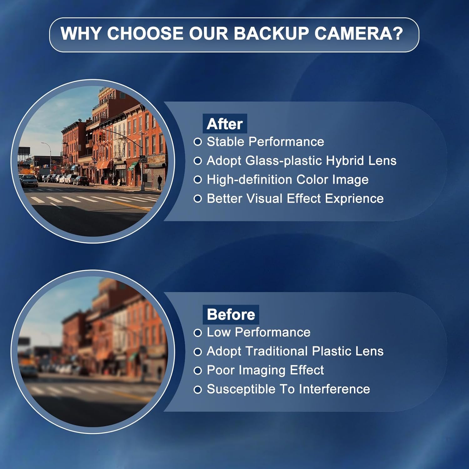 - 【Comfortable and Practical】 The 170° wide-angle backup camera device provides you with a wider field of view for your driving. At the same time, it has a reversing reference line, allowing you to reversing easily, directly lowering the risk of reversing. (Note: The parking assist guide line depends on whether your vehicle has it.)