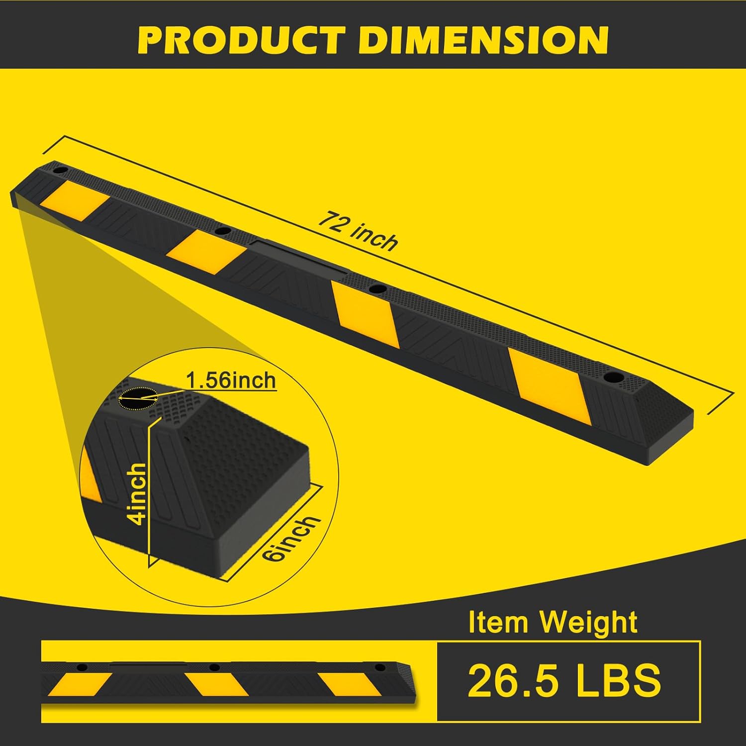 - Safety Upgrade: Rubber parking curbs are more effective in preventing tires from rolling over parking stops and avoiding collisions with walls or other parked vehicles. They better secure cars to the ground, making every parking experience safer. Product Size: 72”x 6”x 4”