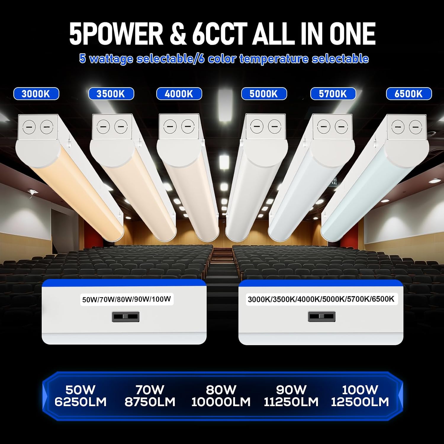 - [0-10V Dimmable] Our 8ft LED shop lights come in 5 adjustable wattages. One light can be switched from low wattage to high wattage, providing 50W-6250lm, 70W-8750lm, 80W-10000lm, 90W-11250lm, 100W-12500lm respectively. With 0-10V dimmable, you can adjust the light level according to the size of the space/amount of light needed in the room, which saves you more money and electricity. Provide a variety of options, there is always one for you