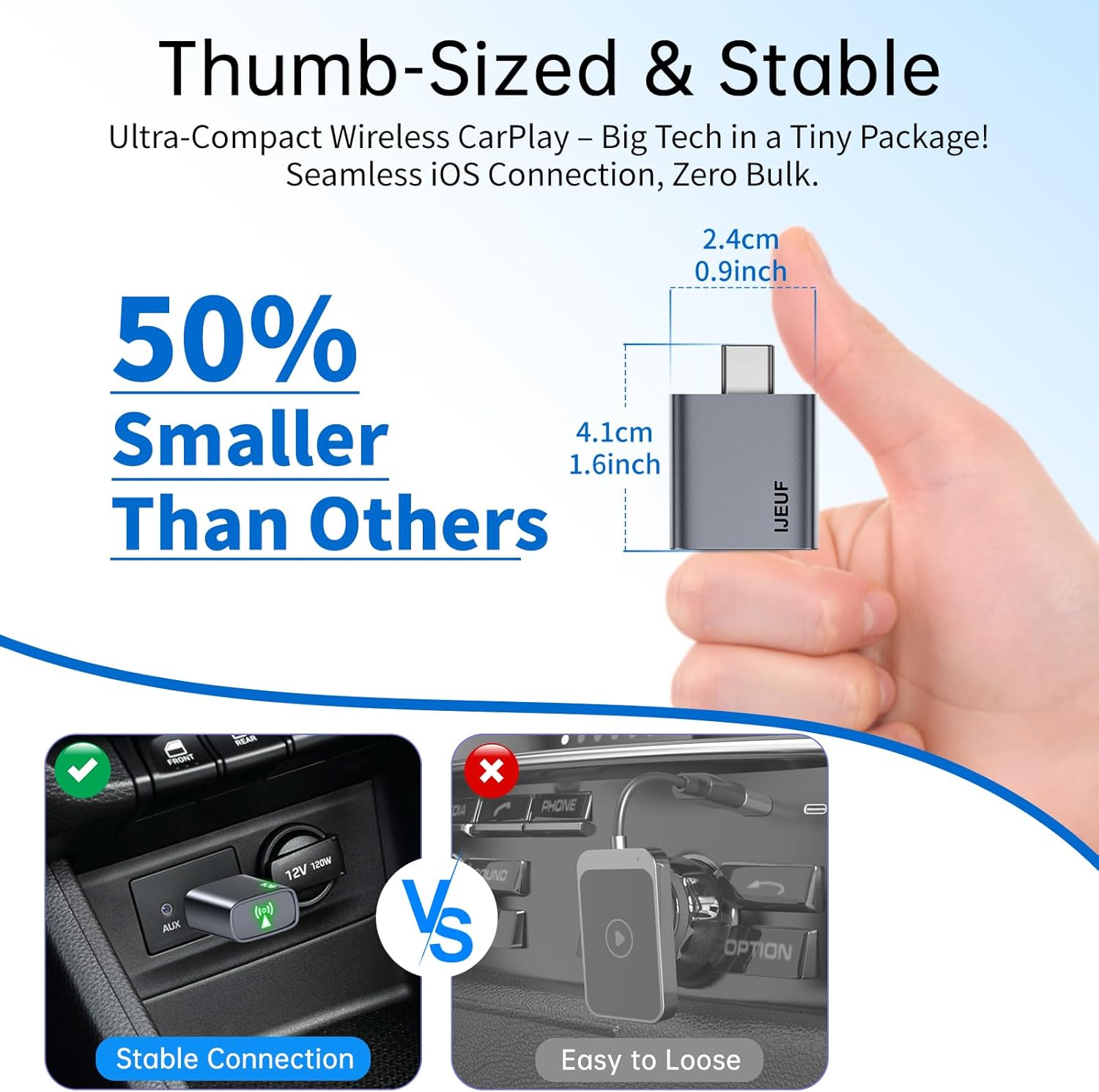 - 🚘【Mini Size, Maximum Durability】 50% smaller than competitors, our mini wireless CarPlay adapter features a flame-retardant AEC-certified shell and a USB port tested for 10,000+ insertions. Built to withstand extreme car temperatures and vibrations while keeping your dashboard clutter-free