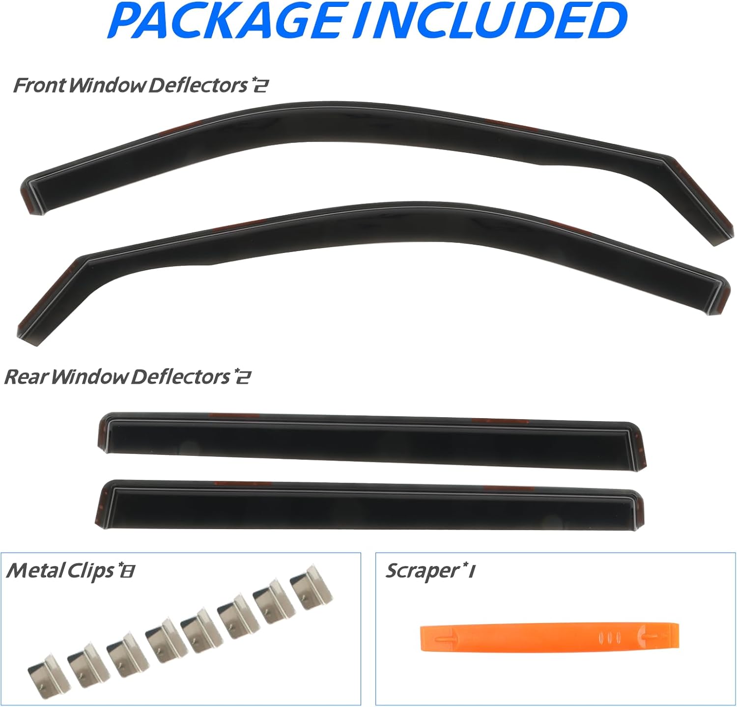 - ăIn Channel Designă CHYKORLA Window vent visors install in the window channel, provides perfect fit and sleek look for your car. Come with 4 pcs FULL-SIZE side window deflectors, 8 pcs clips, 1 pcs plastic Crowbar for a durable and secure installation. No complicated instructions are needed. Attention: Please apply the clip to fix the rain guards
