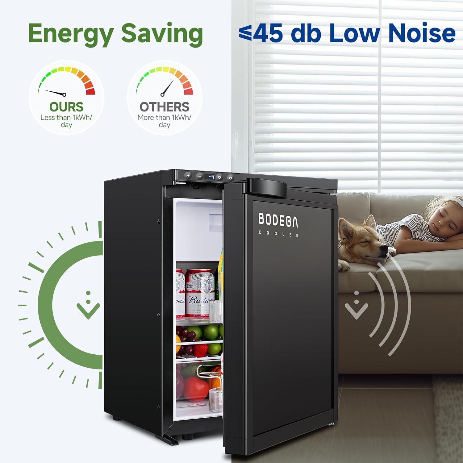 - Dual-Temp Smart Storage: BODEGACOOLER RV refrigerator functions as both a 31.2L fridge and 4.2L freezer (4.2L) in an intelligent dual-zone design! with the upper compartment for freezing and lower section for refrigeration. Perfectly preserves beverages, meats, seafood, and snacks while traveling. This car refrigerator with universal 12V/24V DC compatibility, making it a versatile portable cooler for your RV, boat, or truck. Ideal choice for camping, road trips, and outdoor adventures.