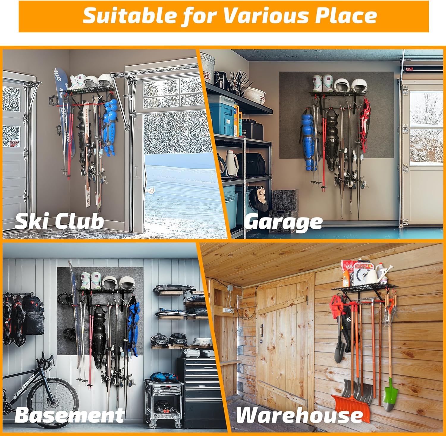 - 【Multifunctional Ski Rack Wall Mount】 This ski rack features both a wall-mounted ski holder and overhead storage space, designed specifically for skis, snowboards, ski poles, helmets, and other ski gear. The top layer offers extra storage, making it perfect for organizing your garage while maximizing space.