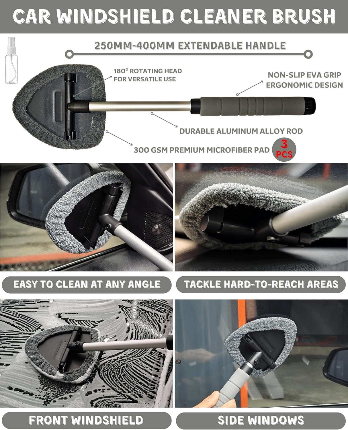 - Durable Tools for Hard-to-Reach Areas: Aluminum alloy windshield brush with 180° swivel head cleans tight spots effortlessly. Detailing brushes feature high-density bristles that won’t shed, paired with a 100ml spray bottle for custom cleaning solutions