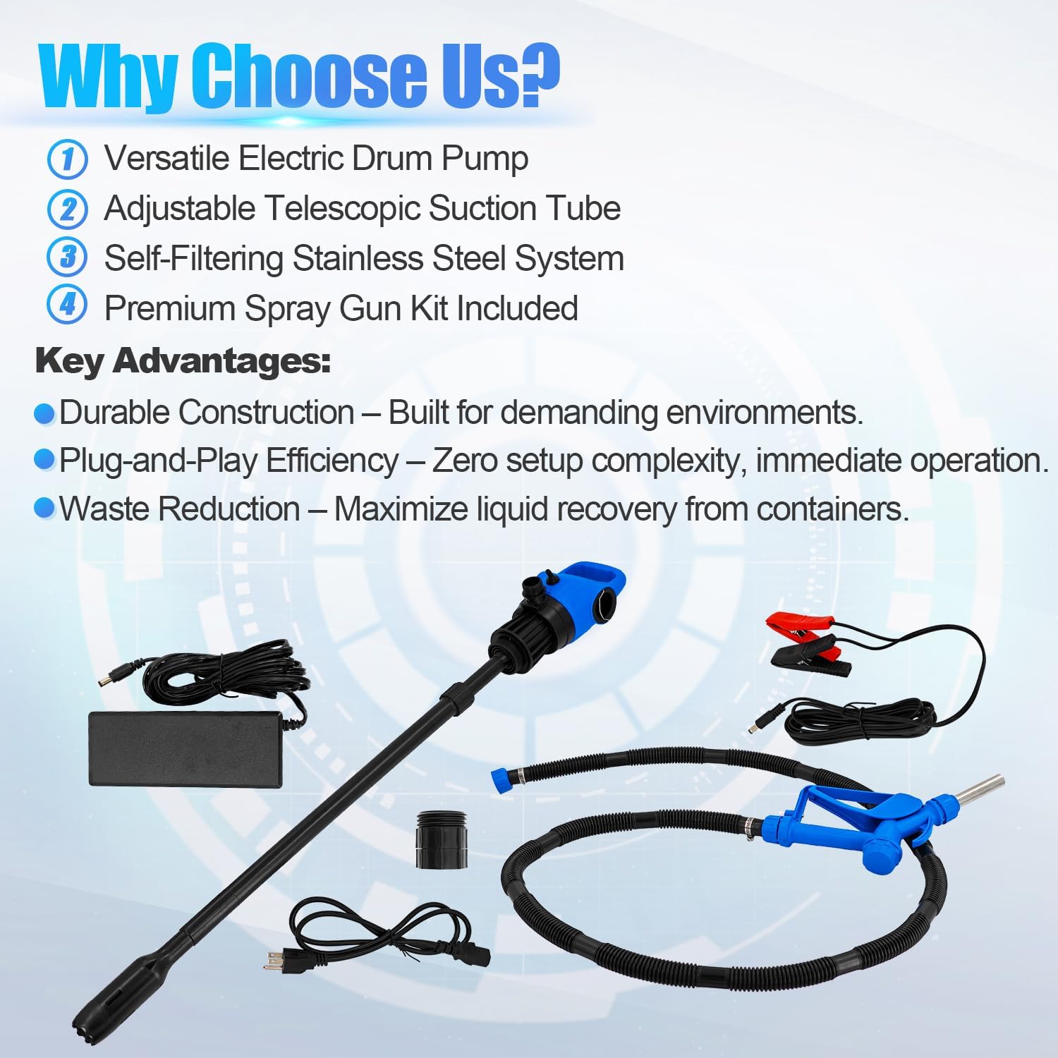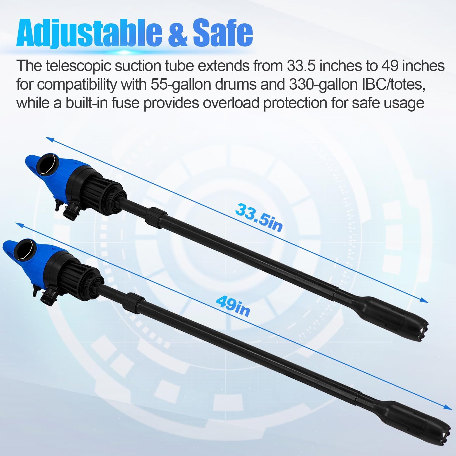 • [Adjustable & Safe]: The telescopic suction tube extends from 33.5 inches to 49 inches for compatibility with 55-gallon drums and 330-gallon IBC/totes, while a built-in fuse provides overload protection for safe usage