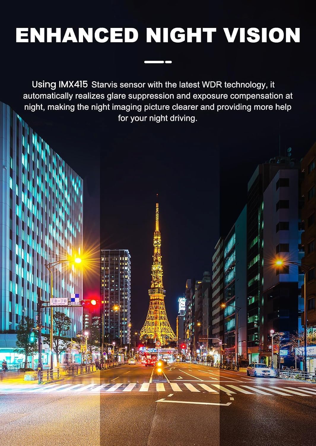 - [Superior Night Vision β Drive Confidently in the Dark] With a Starvis sensor and WDR technology, this dash camera for cars enhances night vision, capturing sharp details even in low-light conditions. The ultra-large aperture improves brightness, reducing glare and dark spots. Whether on dim streets or highways, this camera ensures clear recordings day and night
