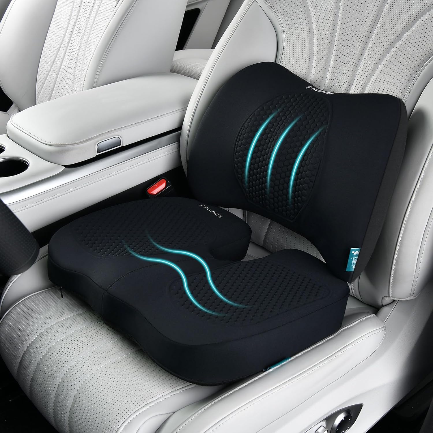 - Upgraded Silicone Memory Foam for Lasting Comfort: Made from soft, supportive memory foam, our back support cushion offers a perfect balance of comfort and firmness. Our office seat cushion features a 3D contoured design that evenly distributes pressure on the hips and legs, alleviating discomfort. It retains its shape without flattening over time, ensuring a cozy experience and support whether youβre working at your desk or taking a long drive