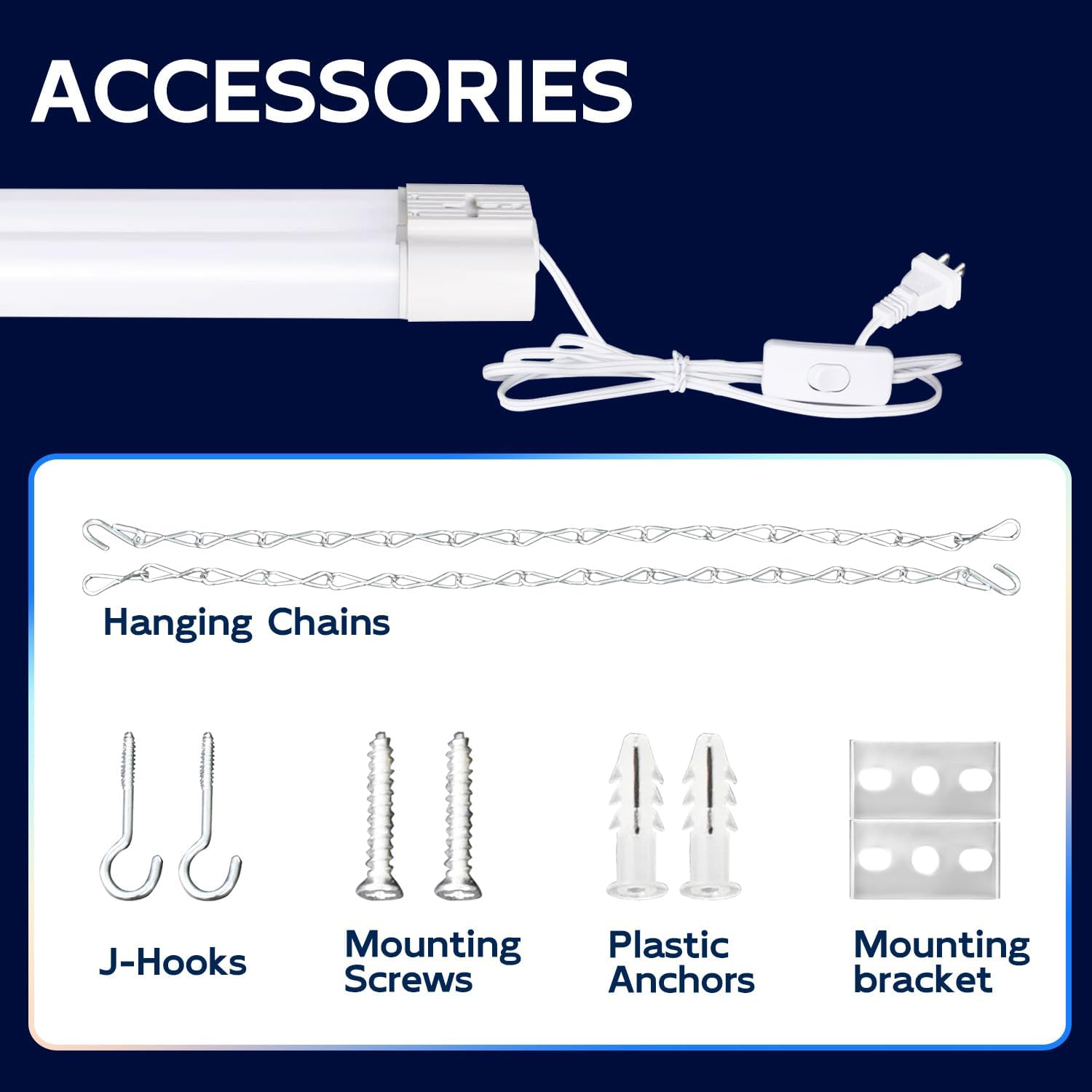 • āœ… Easy Installation - Plug & Play. Come with 59" power cord with on/off switch and other small accessories. You can hanging it with the included hanging chains or directly mounted to the ceiling with the included mounting screws.