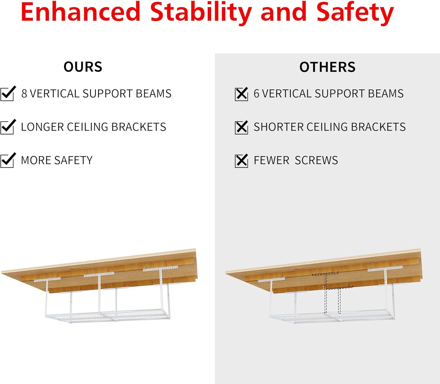 - 【Adjustable Height Rack】 Drop range of 26"–48" fits most garage ceilings and offers up to 122 cubic feet of overhead space—ideal for bins, tires, tools, and seasonal gear. Frees up valuable floor area for vehicles and workstations