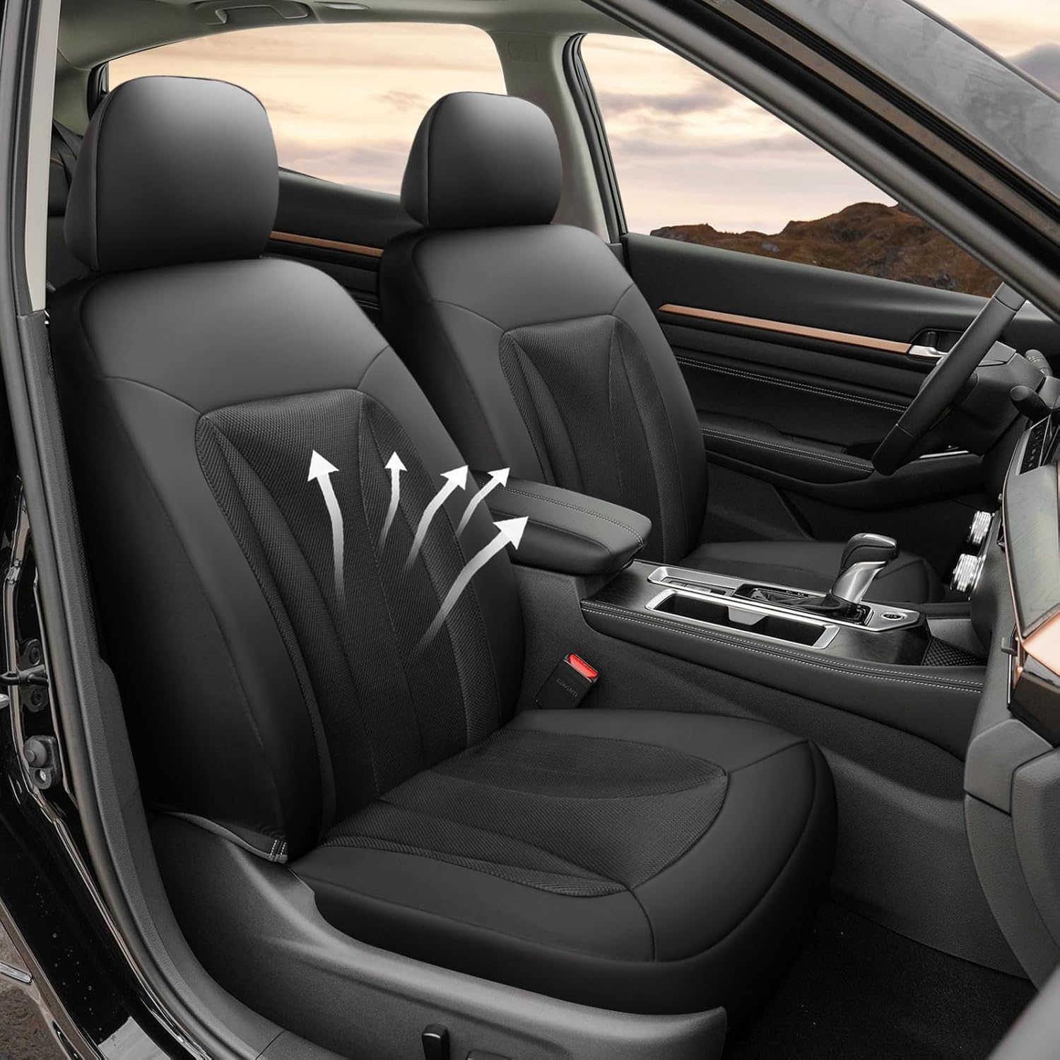 - Our car seat covers combine premium faux leather with breathable mesh fabric. The faux leather provides a luxurious look and durability, while the honeycomb mesh design on the backrest and seat ensures excellent breathability and cooling, keeping you comfortable during long drives and in hot weather.