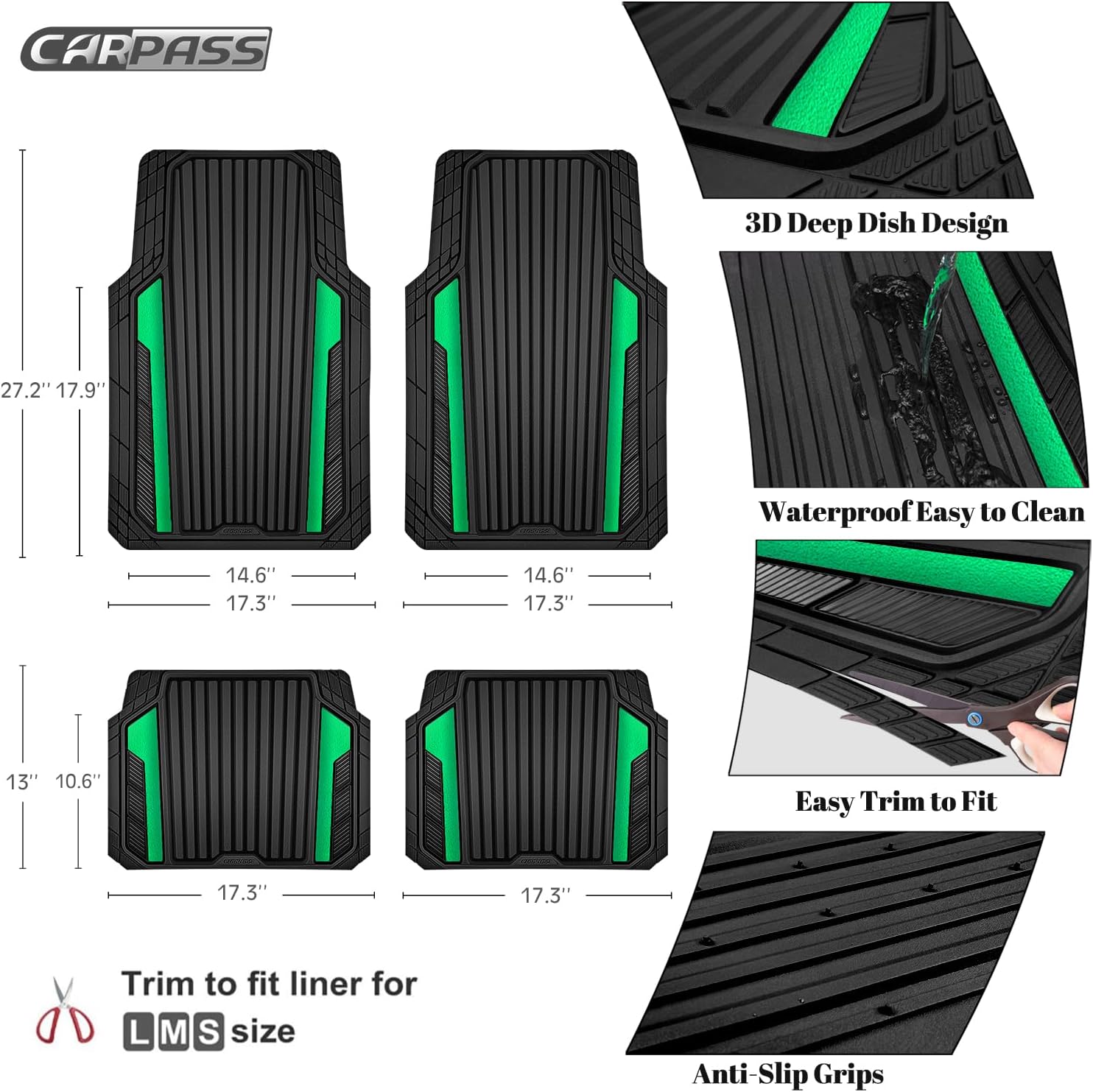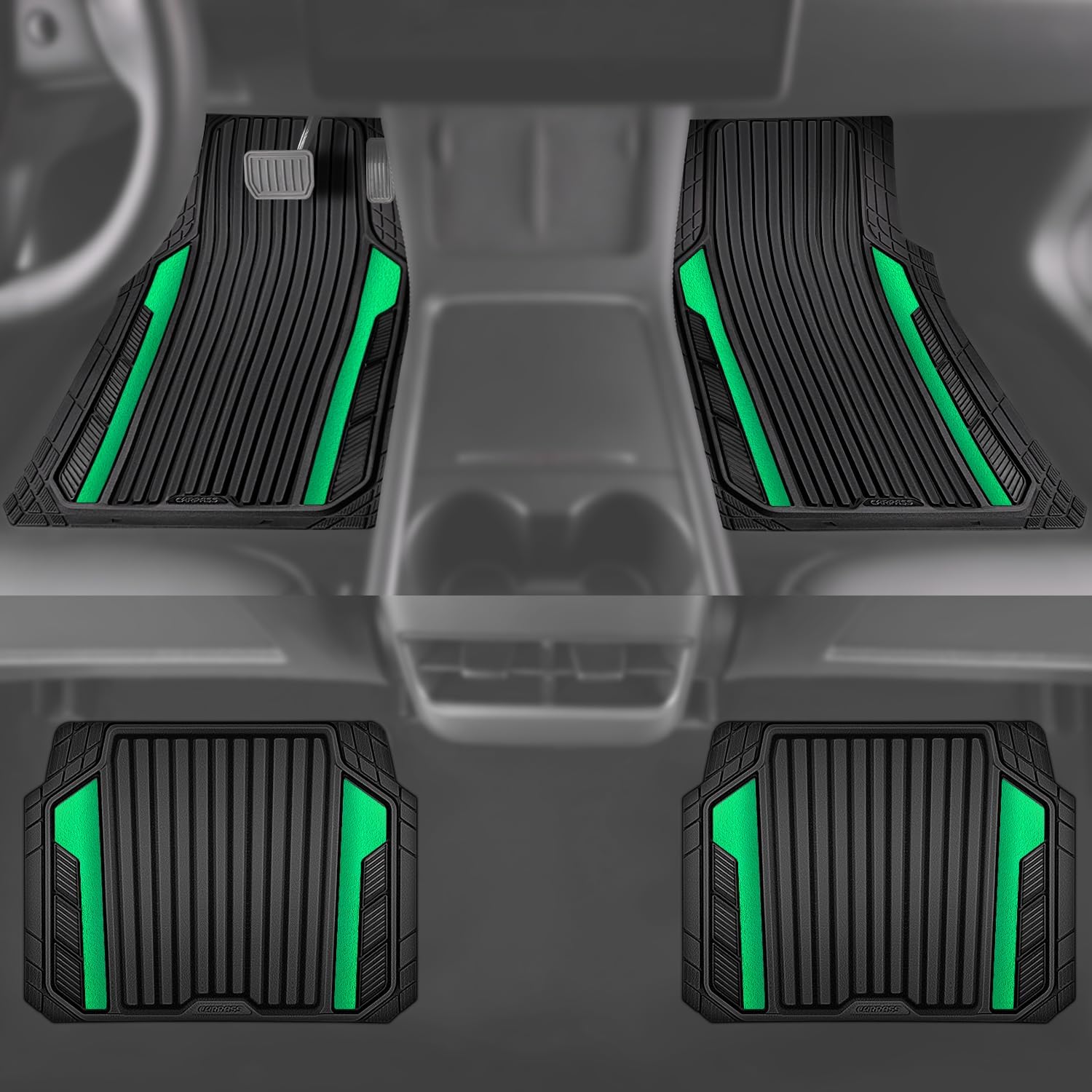 CAR PASS Heavy Duty Rubber Car Mats Metallic,Aluminum Film All Weather Floor Mats Waterproof Universal Trim to Fit SUVs Sedans Vans 4 Piece Anodized Deep Dish Two-Tone Sporty Black Green Chrome
