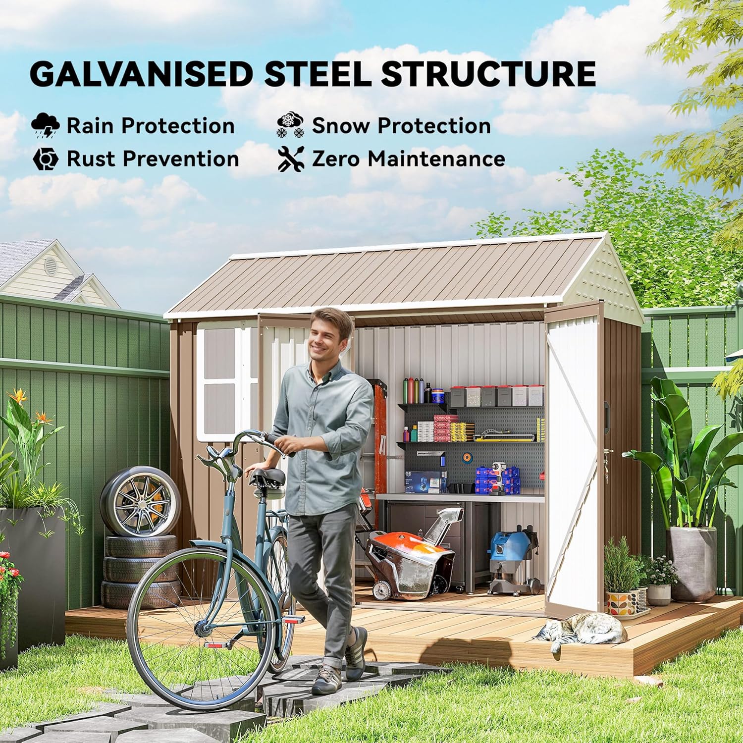 - All-Season Storage: This shed is a safe shelter for garden tools, lawn care equipment, and pool supplies. Don't let its cute cottage look fool you; our metal storage building is heavy-duty with strong, galvanized steel to endure year-round weather.