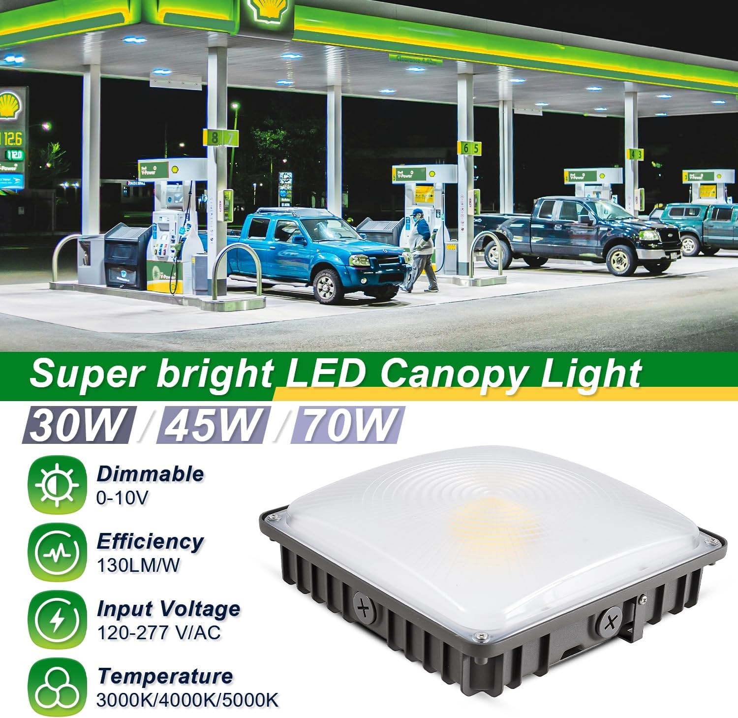 - 🚀【ENERGY SAVING】 - This LED ceiling lamp adopts the latest SMD2835 chip technology, Power Efficacy more than 95% with long life time 70,000 hours. reduces the energy cost by up to 80%. It is the best choice to achieve high brightness and low power consumption LED lighting. With 1-10V dimmable function. OSTEK 70W/45W/30W Power Selectable LED Canopy Light with UL Listed and DLC Certified provids top quality and performance. UL provide security quality, DLC approval good for project subsidy