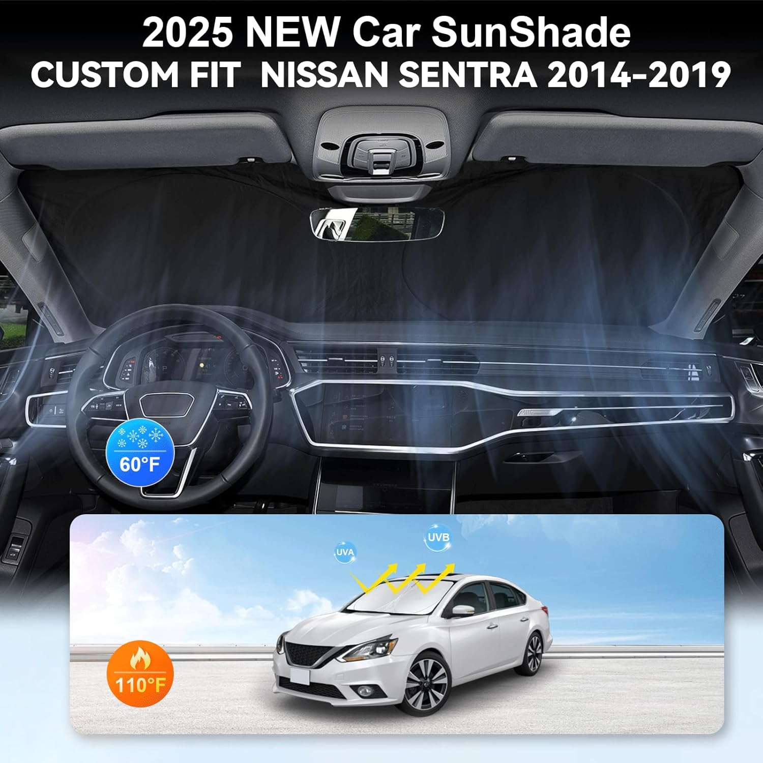 - [CUSTOM-FIT FRONT WINDSHIELD SUNSHADE] Automotive windshield sun shade is Specifically designed,which for Nissan Sentra S, SV, SR, Sedan Accessories 2014-2019 Front Window Car accessories. We have several size of car sunshade. Please measure your car size and refer to our size before your purchase. Once installed it won't have gaps, sags or slumps like other car sun shade windshield
