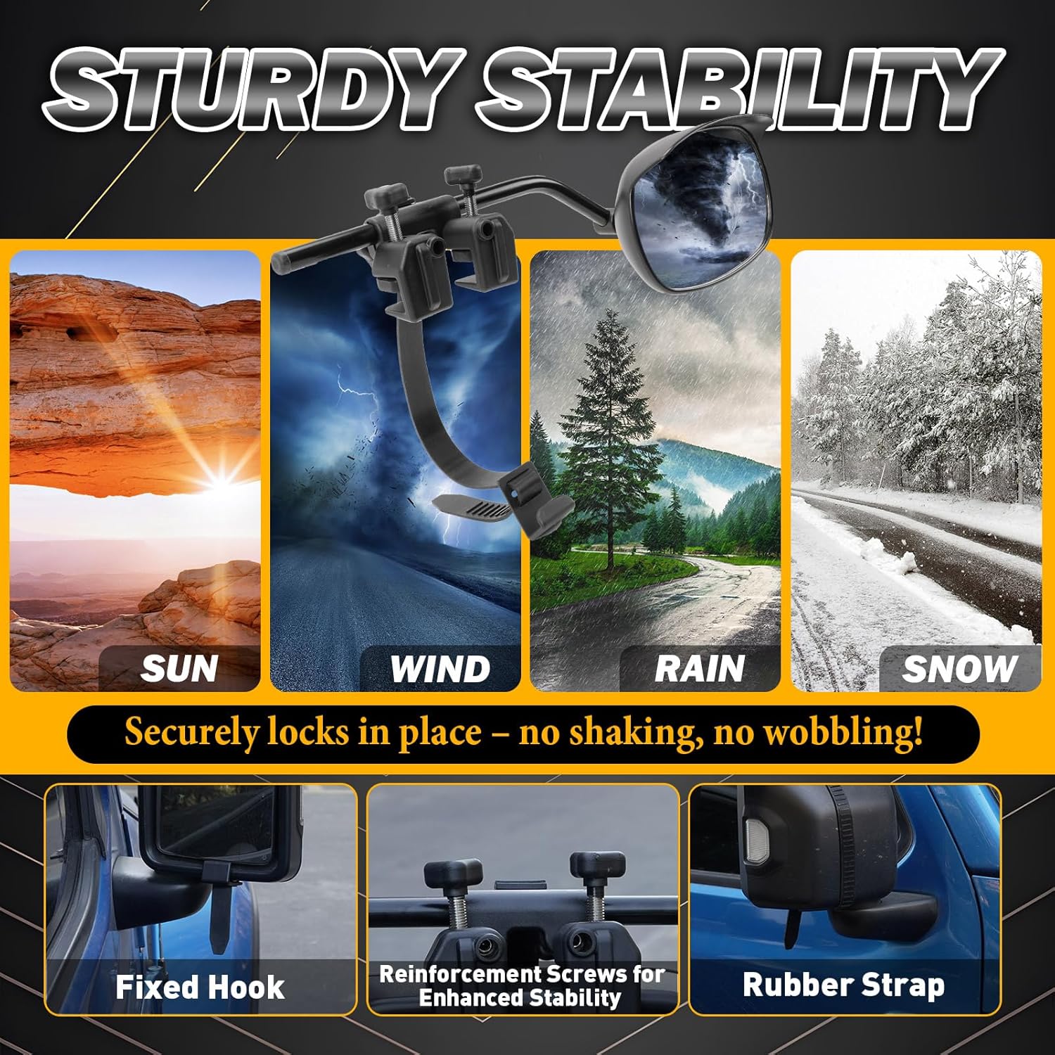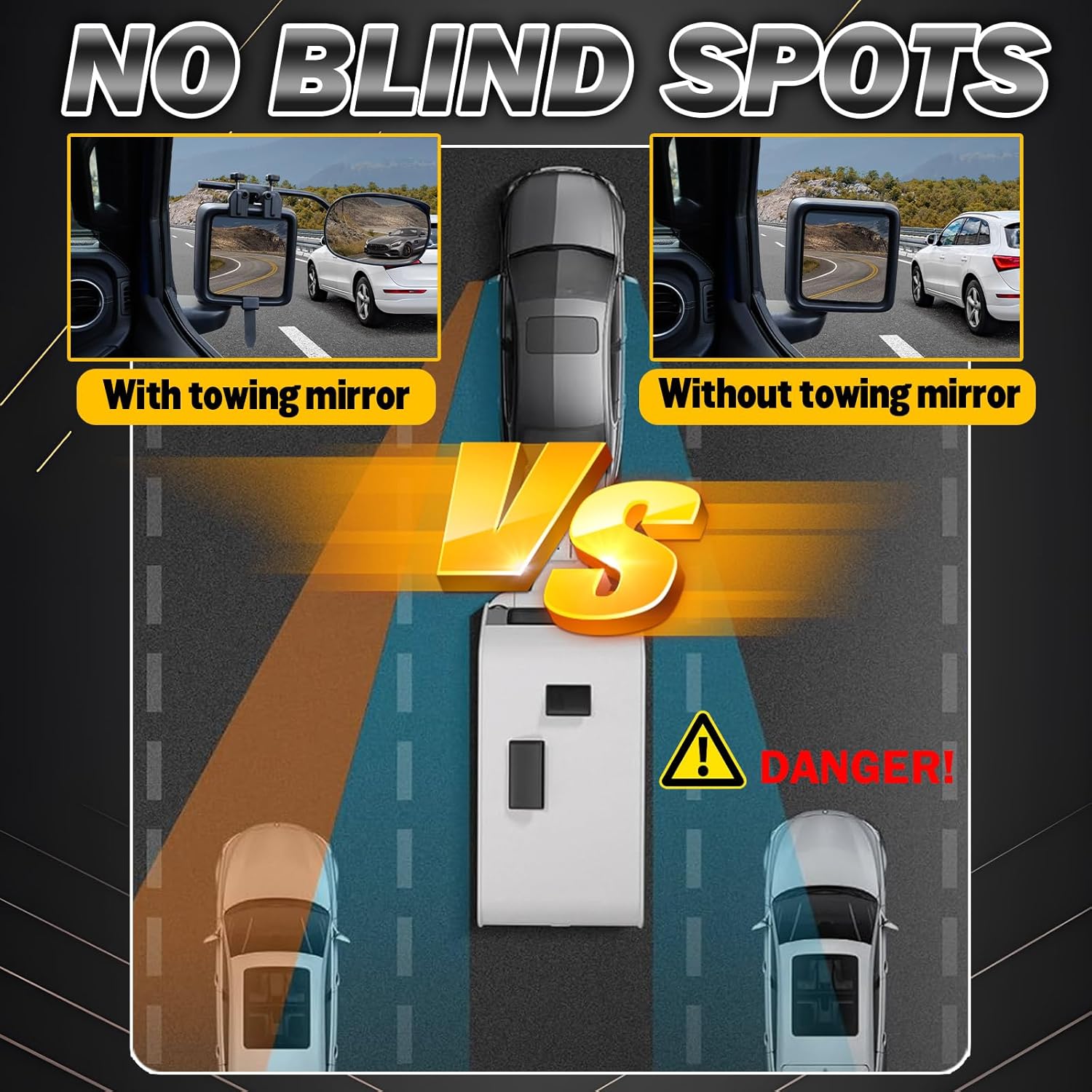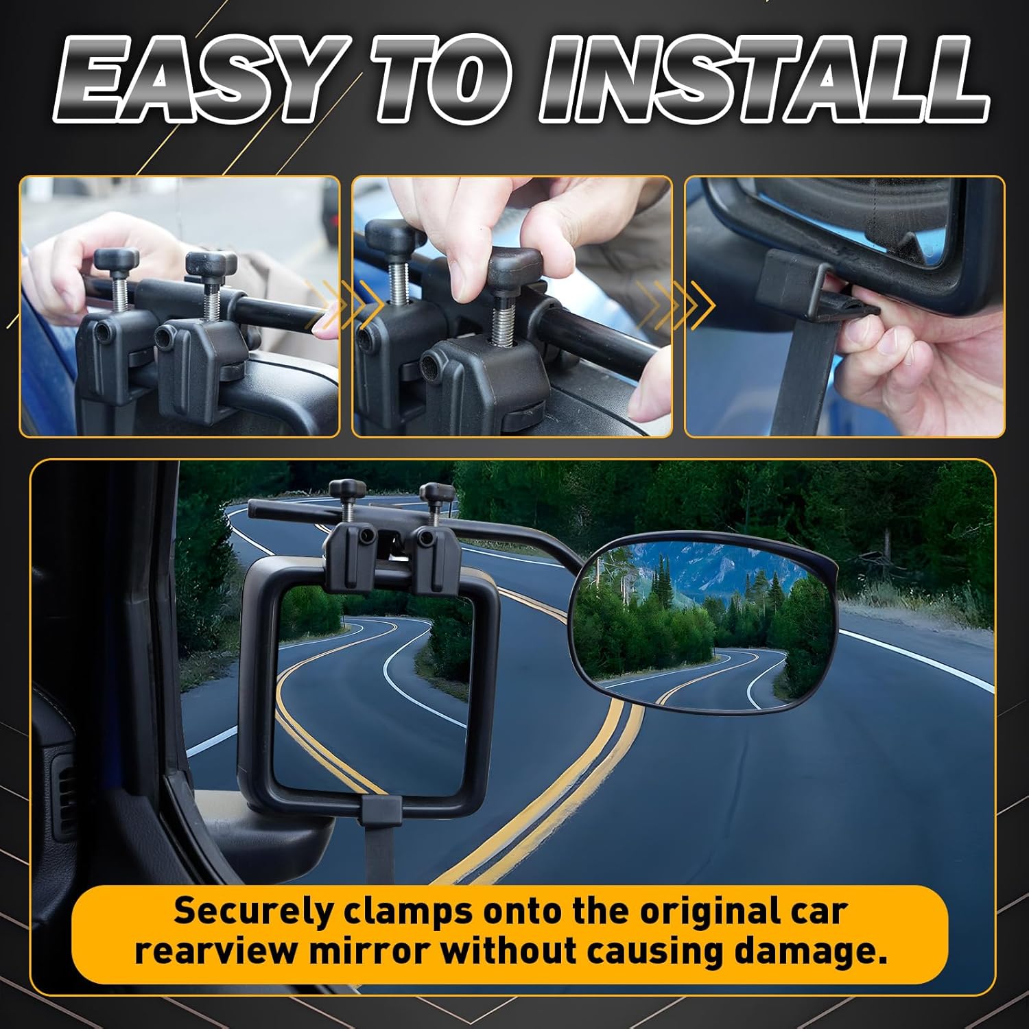 - ăSECURE AND STABLEăThe solid clamps ensure the mirrors stay in place without bouncing or moving while driving, providing a stable view. Built to withstand strong winds and high speeds, our towing mirror ensures dependable performance in all driving conditions.