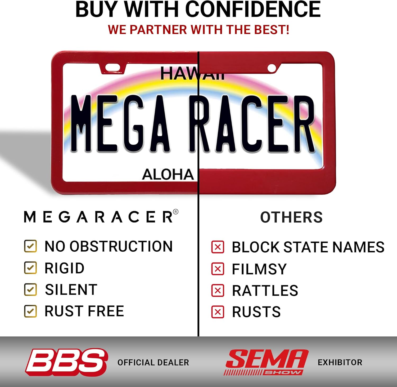 - STRONG DURABLE QUALITY: Our 1 pc License Plate Frame Red Holder is made strong to uphold anything from car washes to weather changes. Mega Racer's red license plate frames are RATTLE PROOF and RUST RESISTANT keeping your vehicle paint SCRATCH FREE.