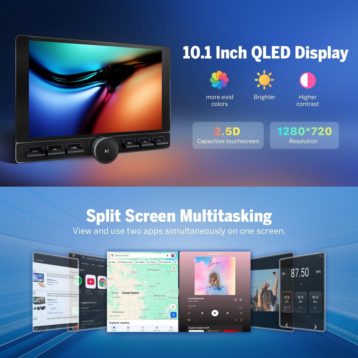 - 【Gorgeous Display】The 10.1-inch QLED screen with 1280x720P HD resolution delivers vibrant, true-to-life colors. Enjoy precise control with the 2.5D multi-touch capacitive screen.