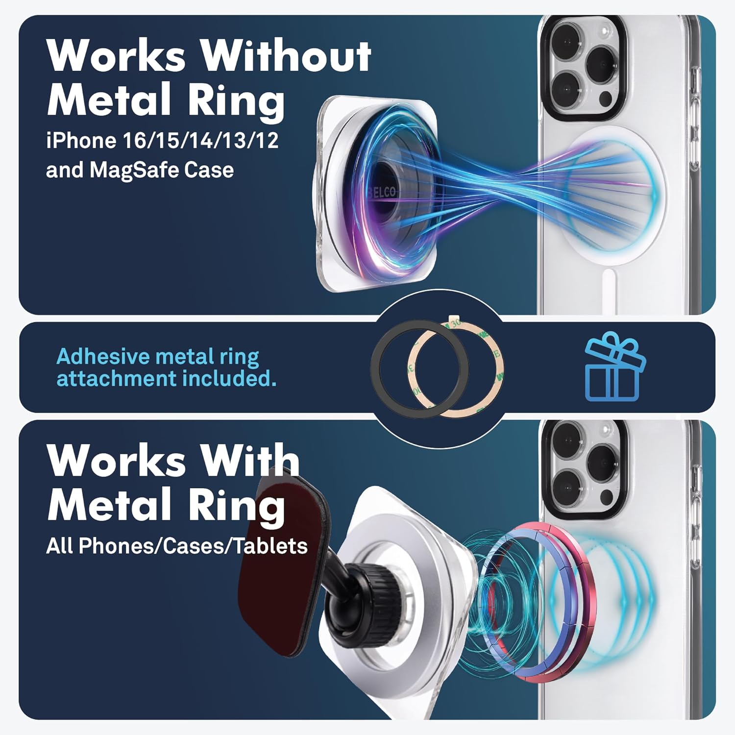 - UNIVERSAL COMPATIBILITY FOR ALL DEVICES: Our premium magnetic car mount is designed to work seamlessly with iPhone, Android, Google Pixel, and other smartphones. Whether your device is MagSafe-enabled or not, the included metal ring ensures a secure, ultra-strong magnetic connection for easy, reliable mounting.