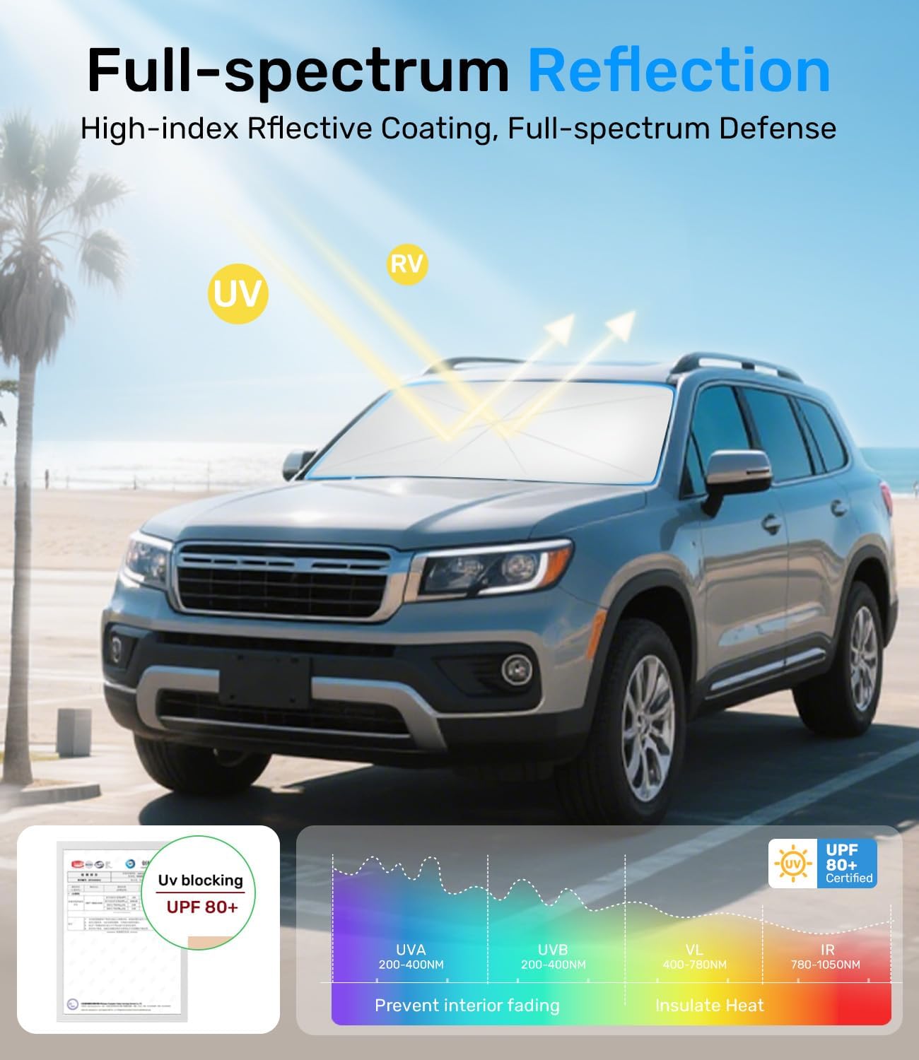 - [Superior Sun Protection and Heat Insulation] This sunshade is crafted with premium sun protection and heat insulation materials and dual-layer insulation, effectively blocking 99% of harmful UV rays. It dramatically reduces interior temperatures by 50%, protecting your car from scorching heat and keeping it cool and comfortable. Say goodbye to long waits in the summer heat and enjoy a refreshing driving experience even on the hottest days!