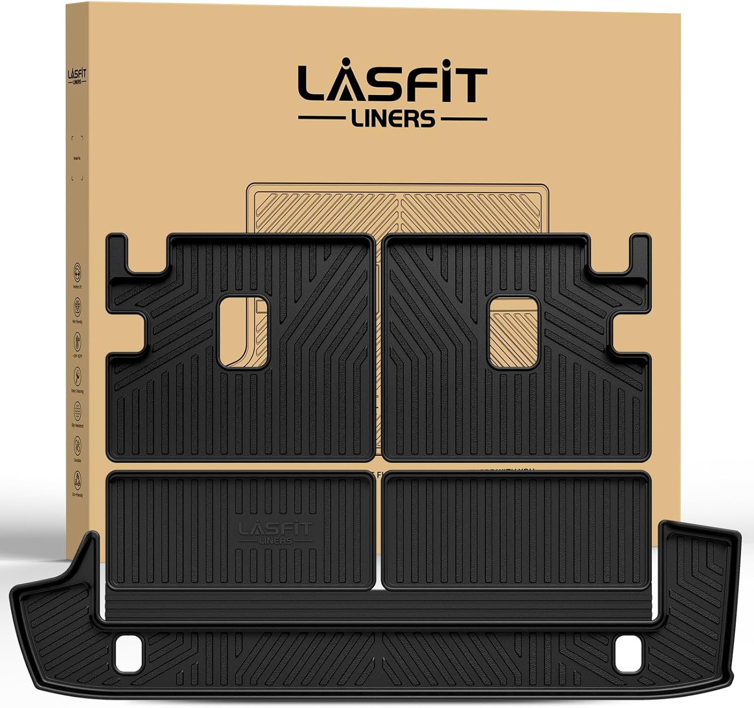 - Premium TPE Material : LASFIT cargo mat made of 100% brand new TPE material (Thermoplastic Elastomer) for a comfortable and soft touch and exquisite finish. More friendly to the elderly, children and pets. Exclusively designed anti-slip studs for more safety and shock and sound absorbent.