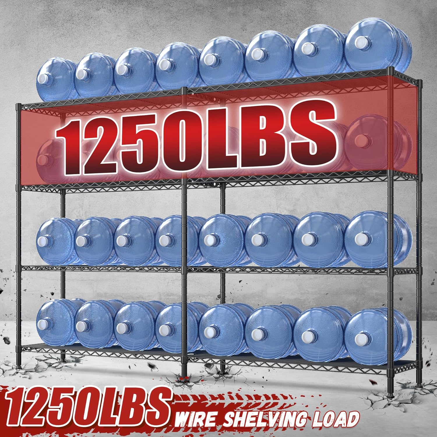 - ă1250 LBS Capacity Super Sturdy Storage Shelving Storage RackăThis Metal shelves for storage made of heavy duty steel wire,and has undergone special coating treatment.Every solid thickened shelving with extra stiffener,can easily bear 250LBS a total of 1250 lbs bearing capacity .which means this metal shelving unit will always be your reliable partner.