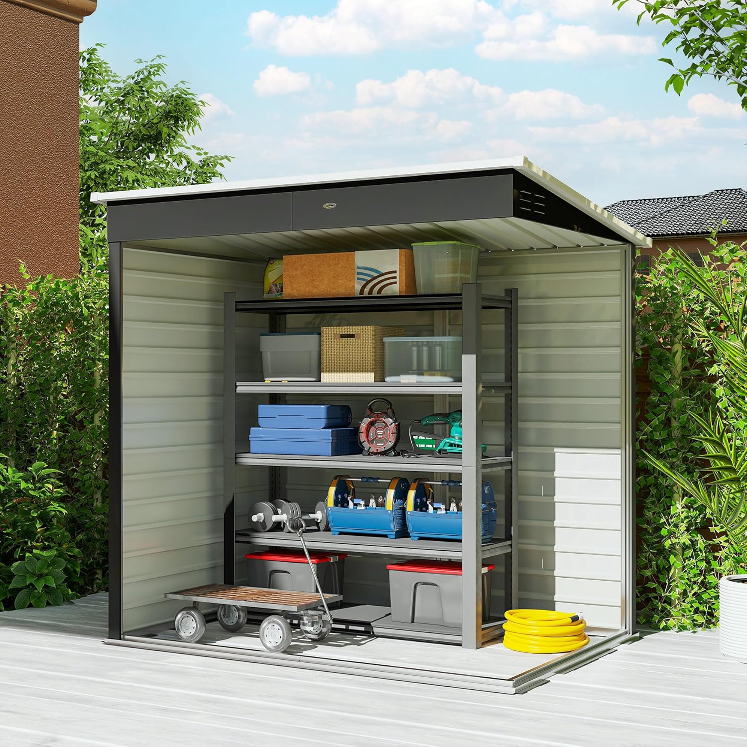 - Compact for small gardens: This 6 x 4 ft metal shed is spacious enough to hold a lawn mower, bike, or long-handled rakes and shovels, it makes organizing easy and your outdoor space clutter-free.