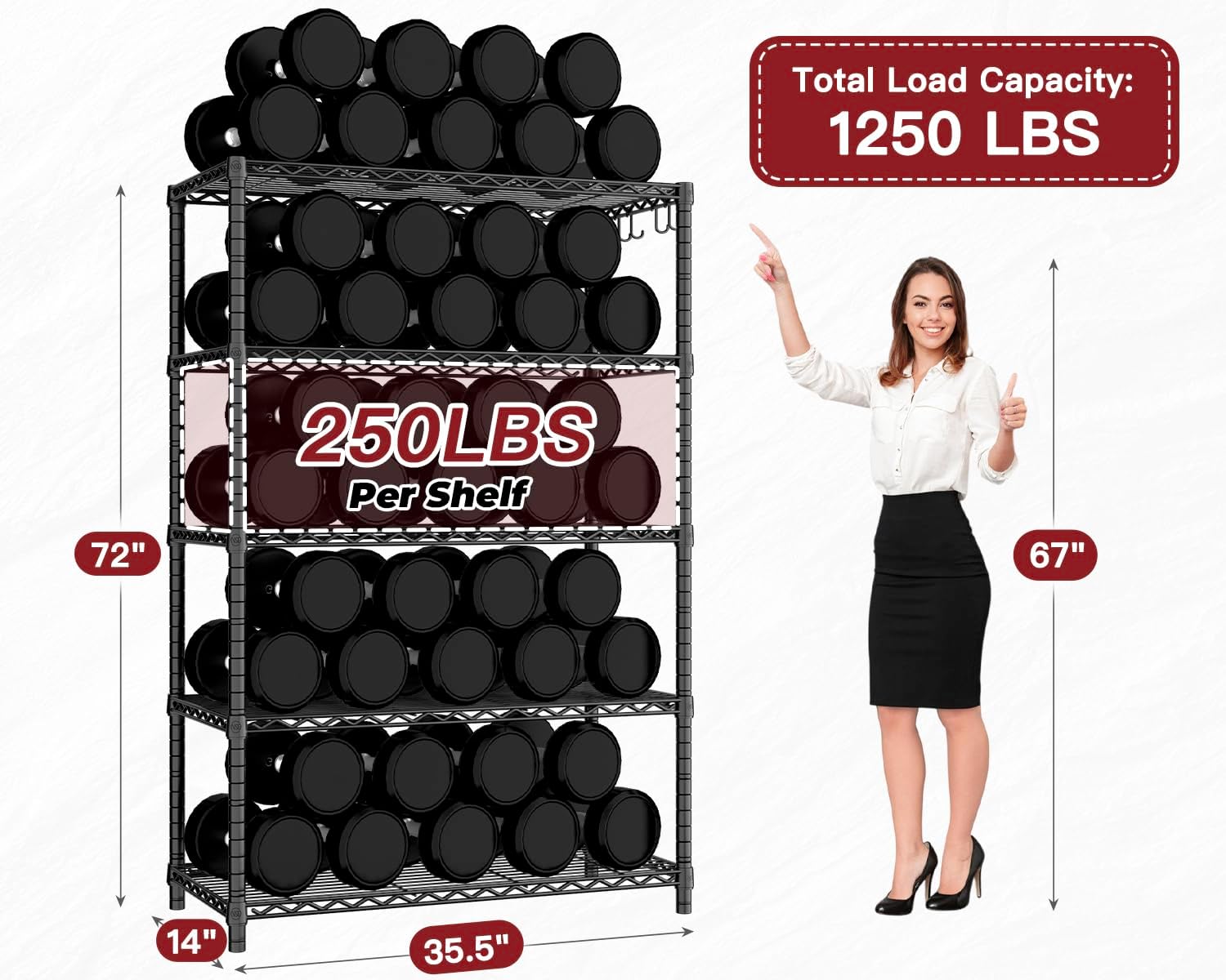 - ă5 Tier Metal Shelving for Storage with Side HooksăThis 5-tier heavy duty storage shelves measures 35.5" W x 14" D x 72" H, providing ample vertical storage space, greatly improving space utilization and making your space look organized. In addition, our wire storage shelving unit comes with 4 hooks for hanging towels, totes, clothes, etc, making reasonable use of more space and improving overall organization