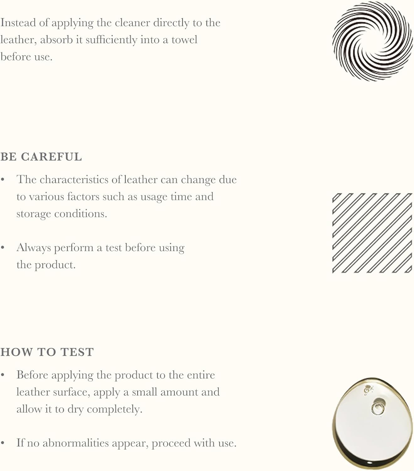 - [How to Use] Before using, test a small, hidden area to make sure it’s safe for your leather. Once applied, let it fully dry for 24 to 72 hours before using the item. Simply absorb a bit onto a clean towel and gently wipe it over the leather surface, making sure to spread it evenly. For best results, apply once a month to keep your leather soft, moisturized, and looking like new!