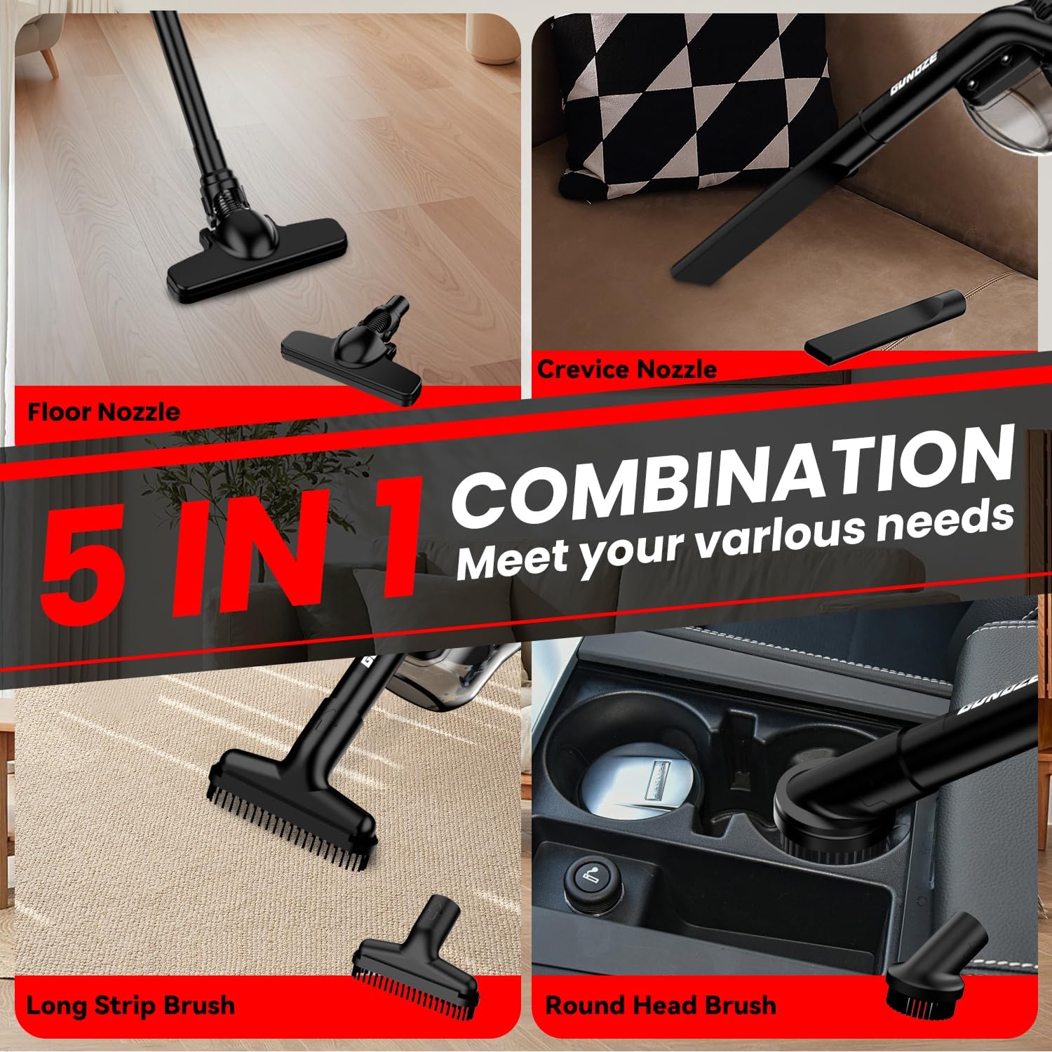 - Your reliable cleaning ally: The vacuum cleaner features a 5-in-1 design and comes with four different nozzles and brushes, this vacuum cleaner can meet all your cleaning needs, whether it's carpets, hard floors, furniture or tight corners.
