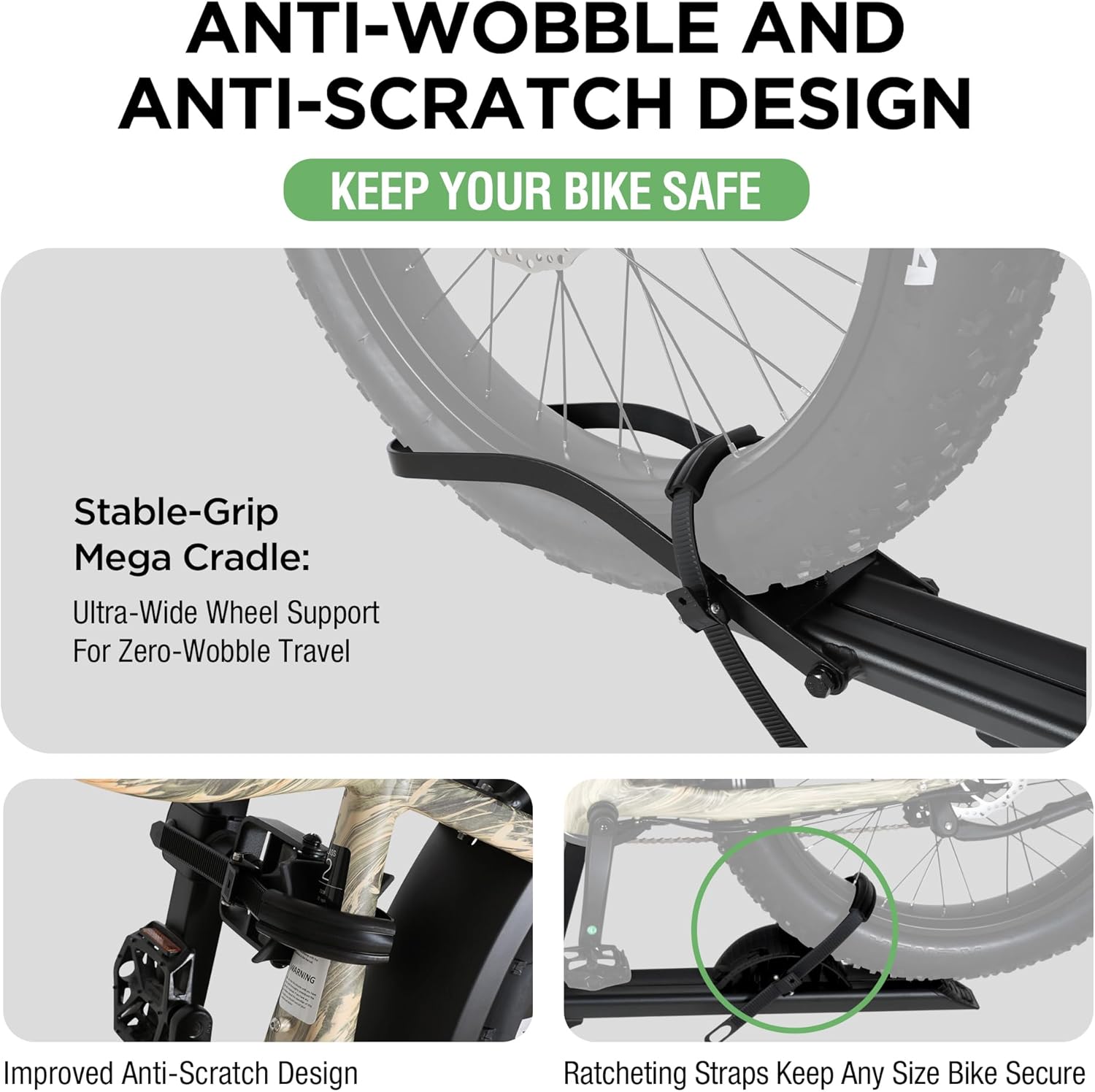 - NO-SCRATCH DESIGN: The rack is elaborately designed to prevent direct contact between the rack's metal surface and your e-bike, avoiding any potential scratch or damage. With ratcheting safety straps, soft padding and rubber covers, your e-bike will be safely tightened onto the rack, facing the slightest wobbles even on the roughest roads.