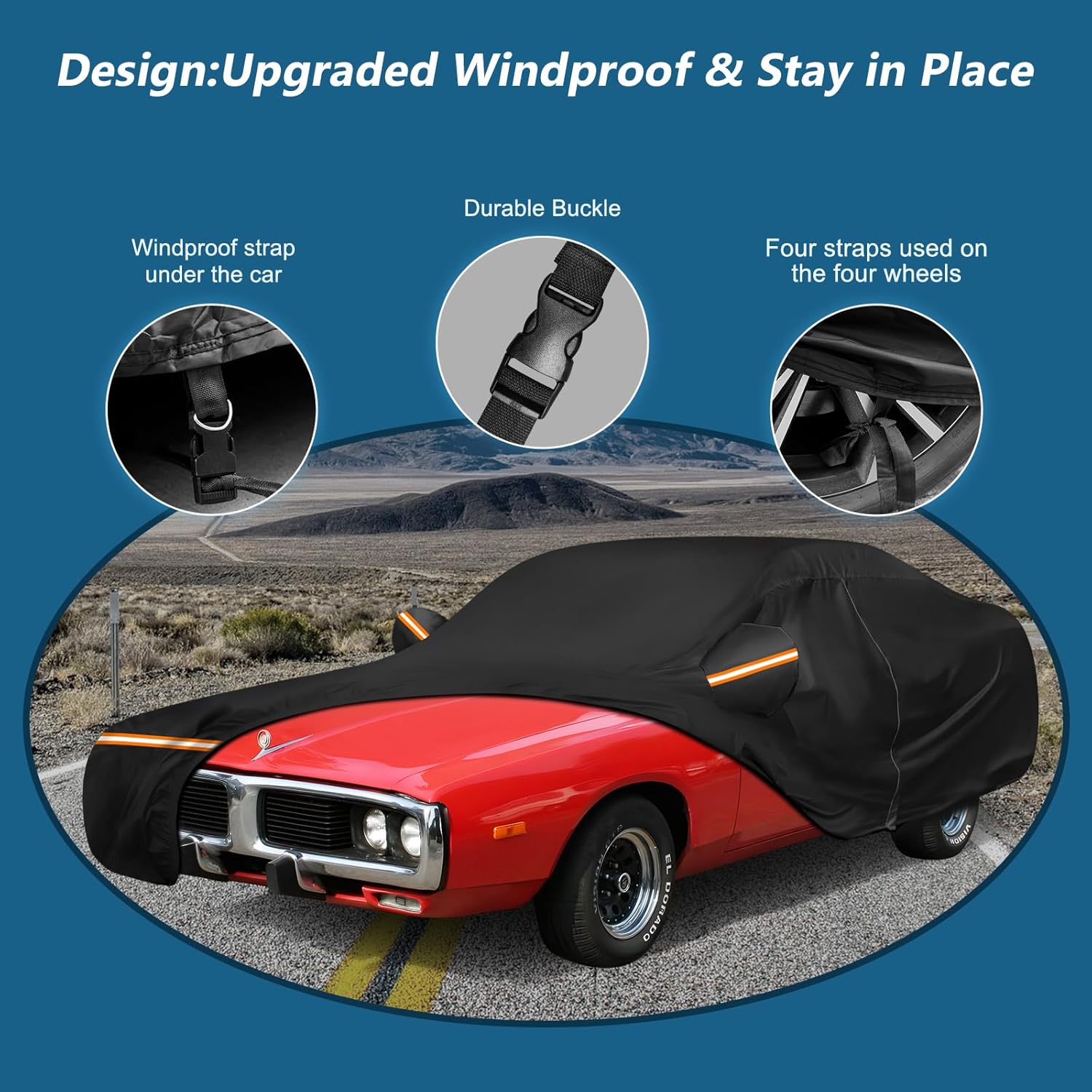 - ăUpgraded Windproof Design-Stay in Placeă*1. Four straps are used on the four wheels to make sure the cover stays in place. *2. A windproof buckle passes through the middle of the car. *3. Elastic hem at the bottom of front and rear to ensure the cover fits your car and to protect your car cover from blowing off, even in heavy wind. *4. There are two extra-long straps for the hood and rear wind protection.