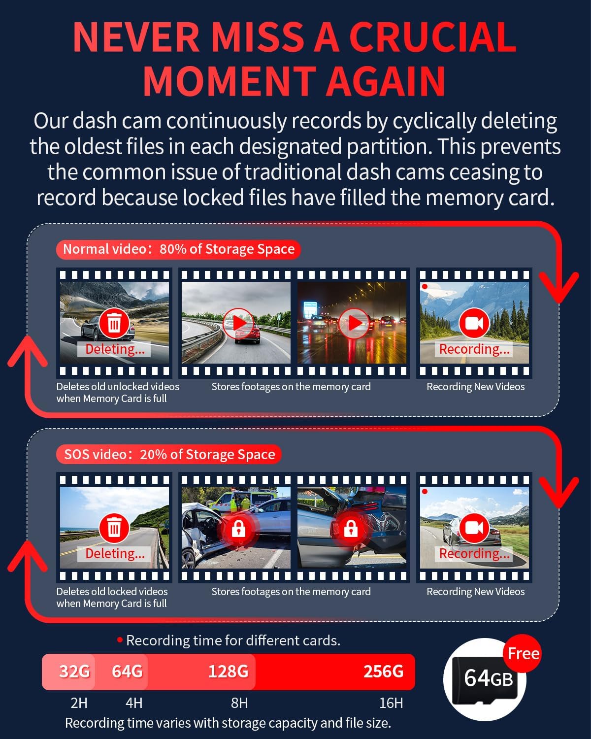 - 24-Hour Parking Monitor Mode: After Parking and Turning Off the Engine: The dash cams enters parking mode to monitor the surroundings continuously. It records in a time-lapse mode at one frame per second, saving energy and space, and requires an optional ACC hardwire kit (sold separately). A built-in G-sensor detects impacts, triggering a one-minute video recording securely stored in the event folder, keeping you updated on your vehicle’s status.