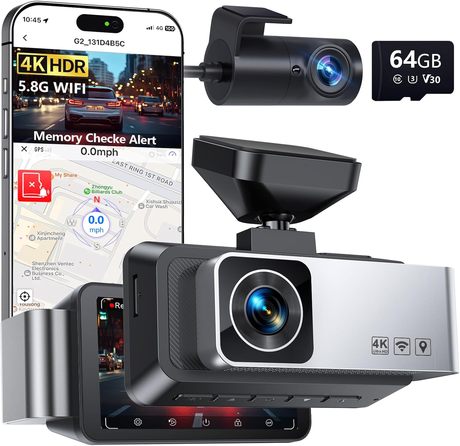 Dash Cam Front and Rear, 4K Full HD Dual Dash Camera for Cars, Built-in Memory Card Monitoring, 64GB Card, 5G WiFi GPS, Car Camera with 3" IPS Screen, 2160P Night Vision, Parking Monitor
