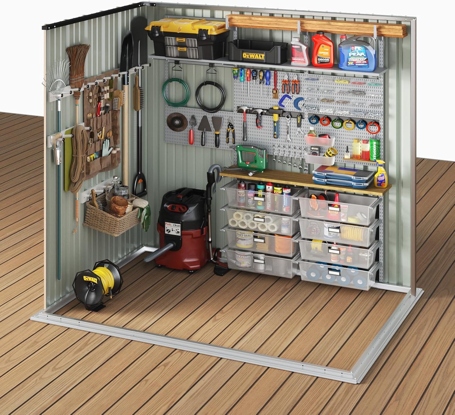 - Spacious & Heavy-Duty Design: Measuring 89"x74"x77" (7.4x6.1x6.4ft), this single-slope metal tool shed offers expansive storage for bulky equipment like bicycles, generators, lawnmowers, and gardening tools. Engineered with rigorously tested galvanized steel panels, its robust structure ensures long-lasting durability and 100% waterproof protection against harsh weather