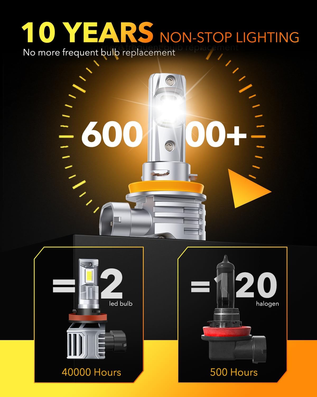 - 60,000HRS LONGER LIFESPAN: OXILAM Q26 H11 9005 bulbs combo use less power than halogen bulbs which means produce less heat. These LEDs are equipped with a whole aluminum body and temperature control element for continuous lighting without damage shortly. Save money in the long run and provide peace of mind knowing that your lights are less likely to burn out