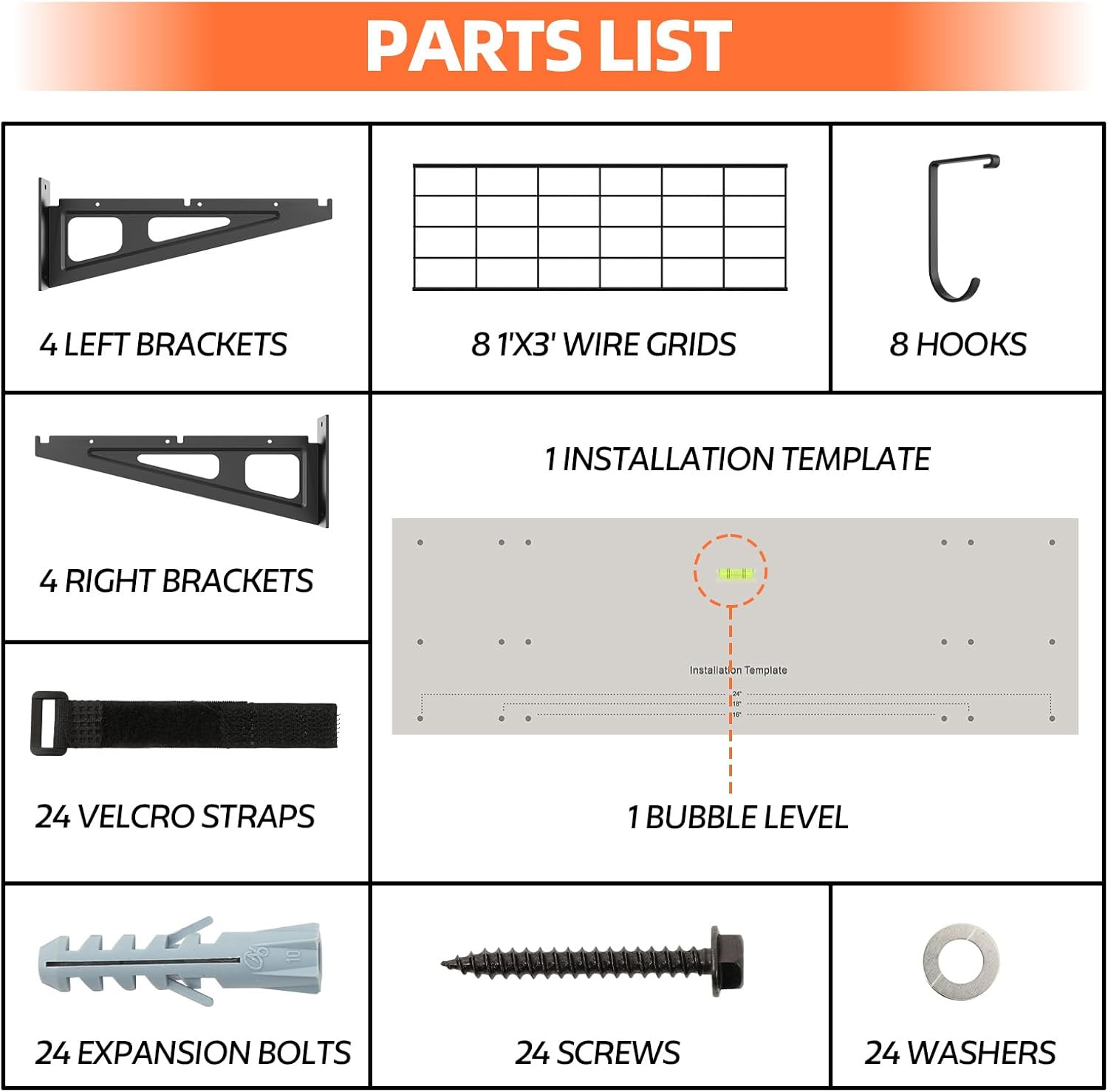 - Garage Hooks Heavy Duty: This shelving unit is designed for DIY assembly and consists of 8 1x3ft grid panels. It also comes with 8 hooks, so you can choose different installation methods according to your needs, such as parallel installation, vertical installation and separation installation, to make the most of your space.