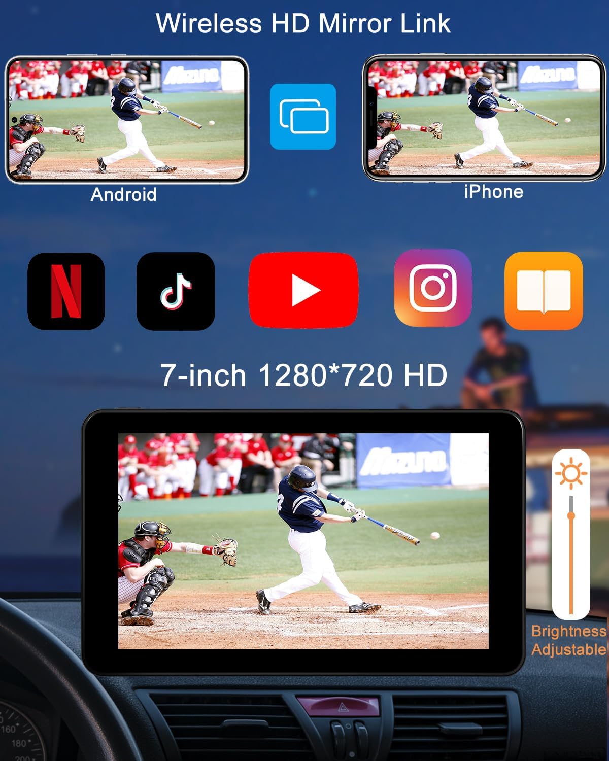 - 【Powerful Audio and Video】1280*720 HD touch display brings you more stunning visual effects than mobile phones. Built-in stereo speakers. At the same time, you can connect to your car audio through Bluetooth, FM and AUX cables to bring a better music playback experience.