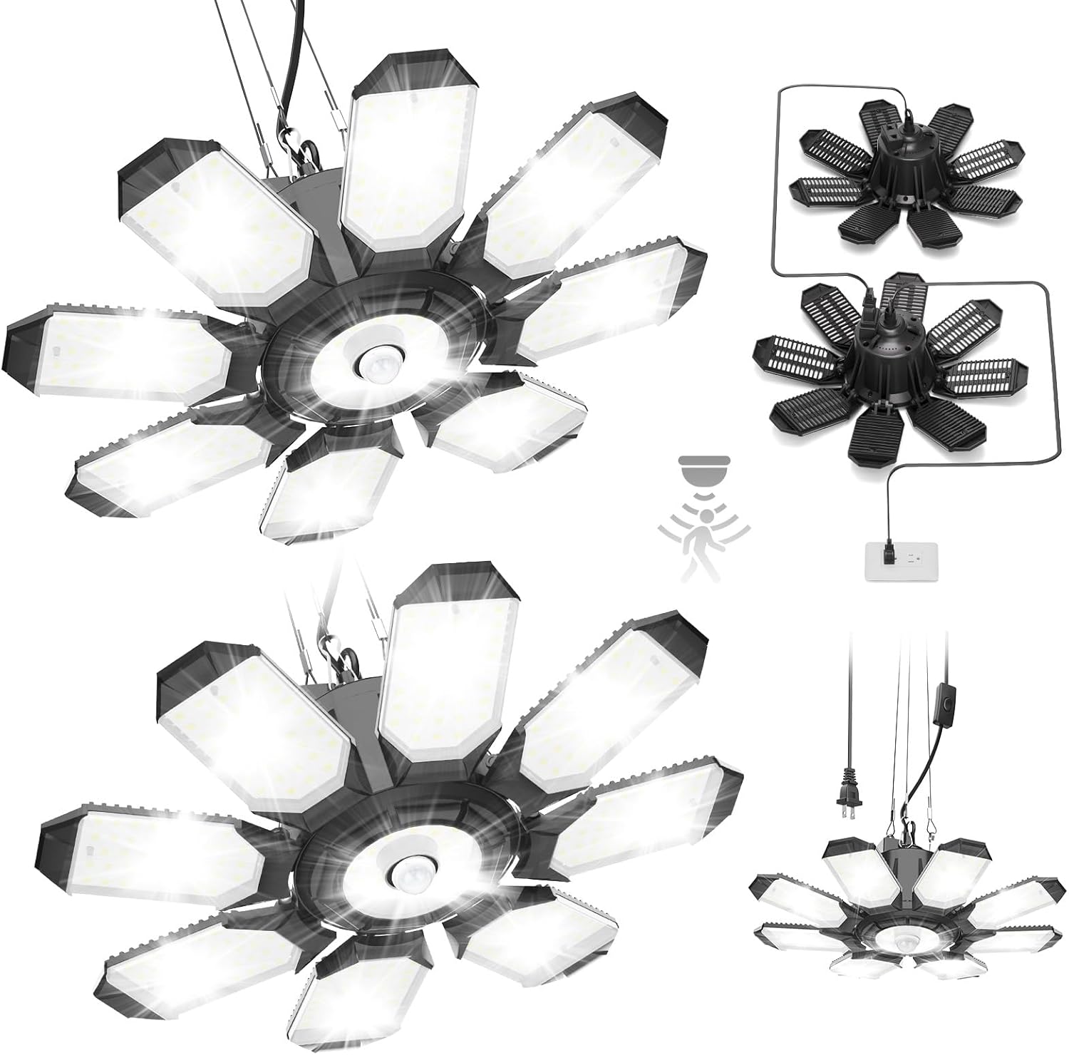 TANBABY 2 Pack Motion Sensor Garage Light, Deformable Garage Lights Ceiling LED Plug in Cord, Plug in Shop Lights with 8+1 Panels Bulb for Basement