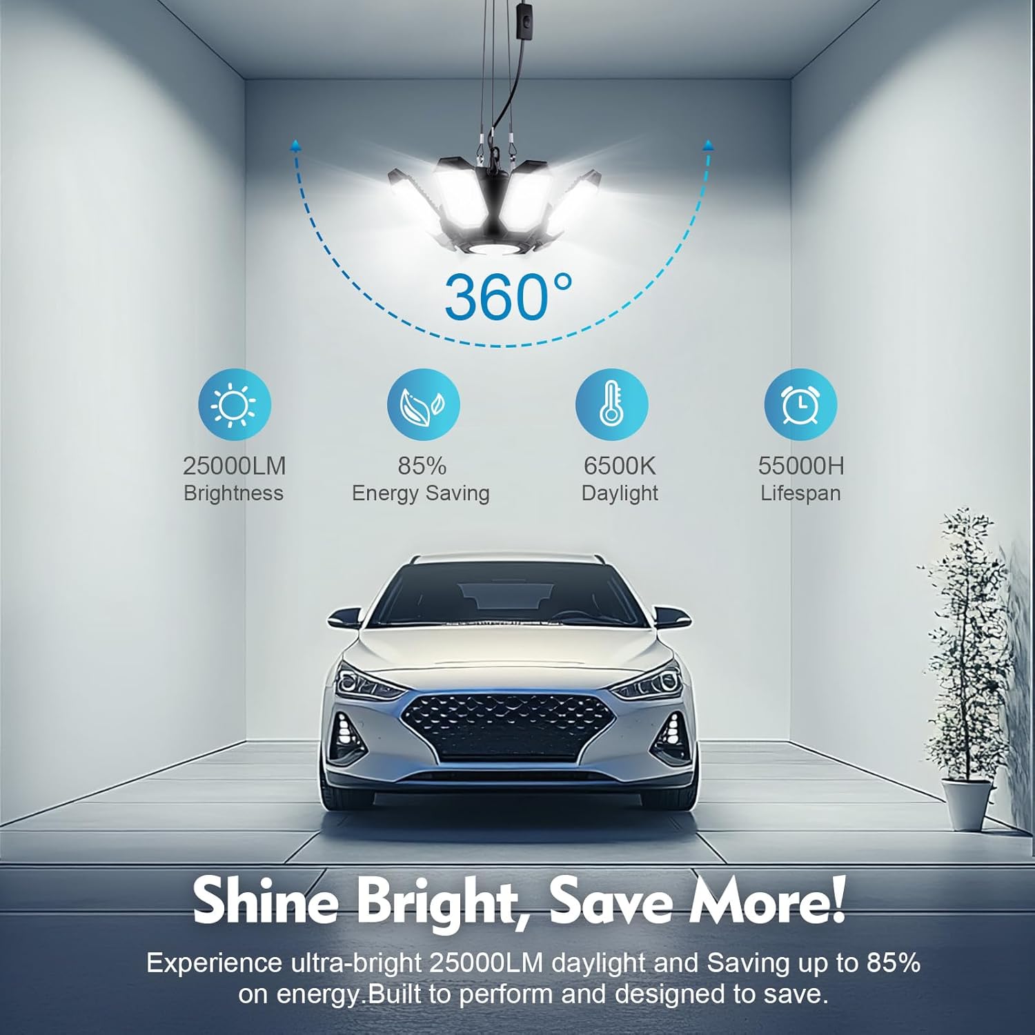 - 【Easy-to-use plug-in garage lights】Plug-in garage lights are easier to use than traditional garage lights, no socket required, plug and play. This means you can hang your garage lights anywhere (hanging plug in garage light, Stand garage light etc). You can even connect them together and you will get very, very bright garage lighting. Note: Maximum only support 4 garage lights connected lighting