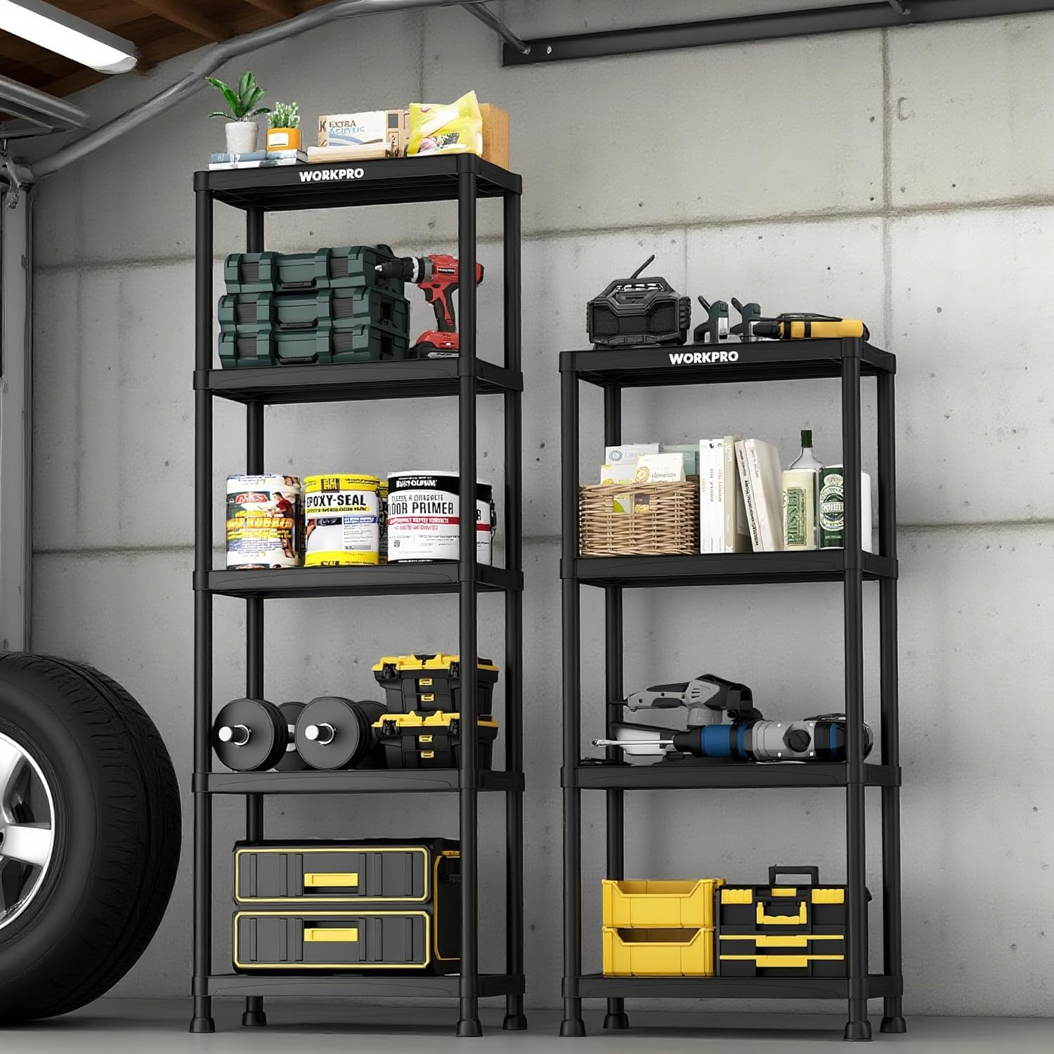 WORKPRO 5-Tier Plastic Storage Shelves, 500lb Capacity Shelving Unit, 67.1" H x 23.9" W x 12" D, Storage Rack for Garage, Home, Pantry, Office, Laundry, Tool-Free Assembly, Black