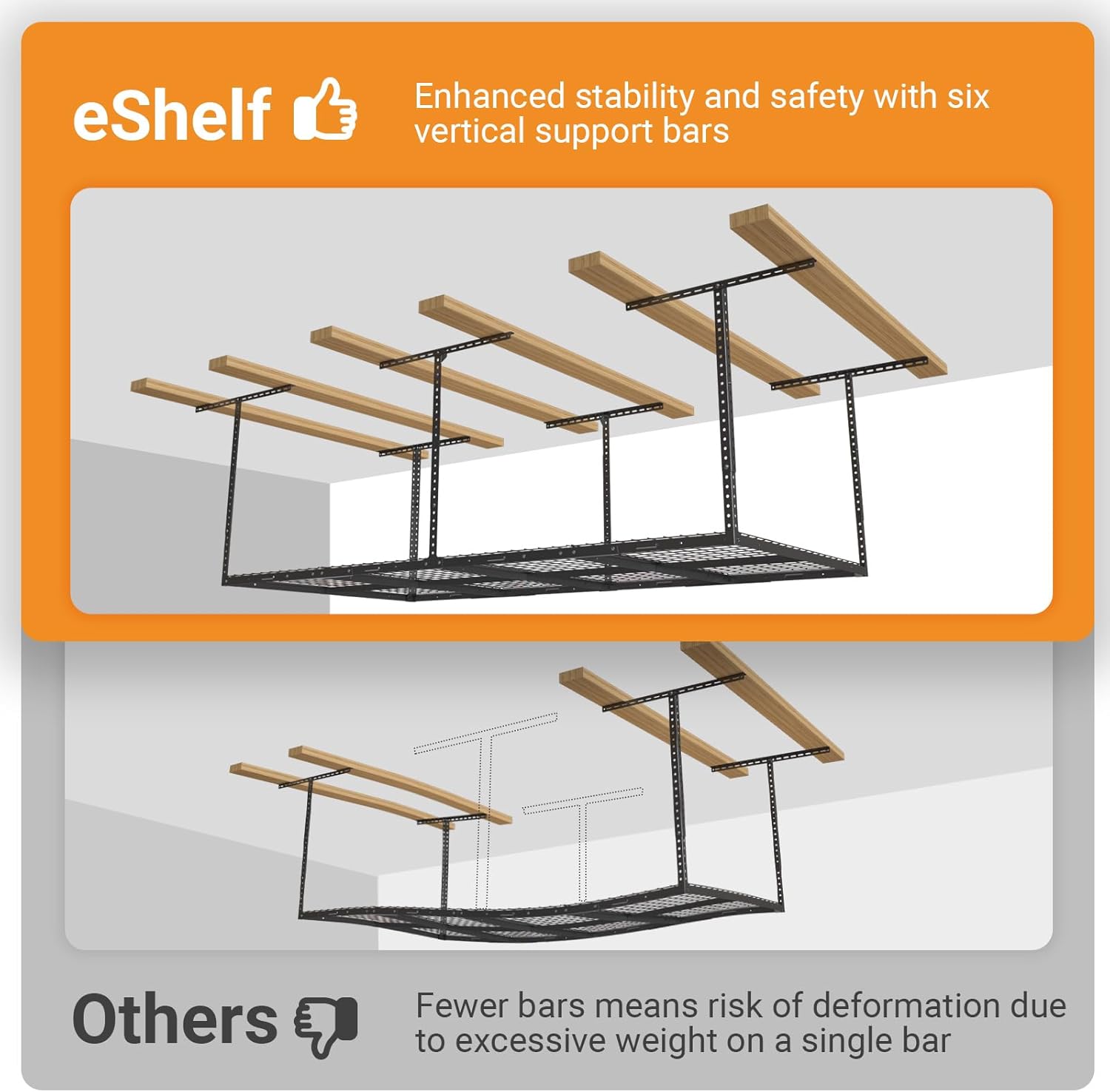- Clear Floor Space: The overhead garage storage rack utilizes unused ceiling space, freeing up valuable floor space in the garage. It allows for vertical storage, maximizing storage capacity while preserving the maximum amount of floor space.