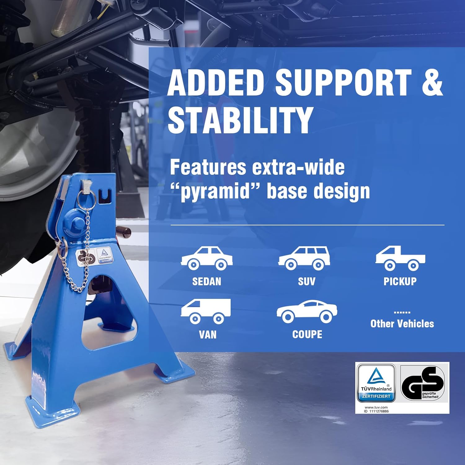 - Sturdy and Safe to Use: Double locking jack stands help support vehicles after lifting with a jackincluding a limited 1-year manufacturer warranty and meeting US safety standards.