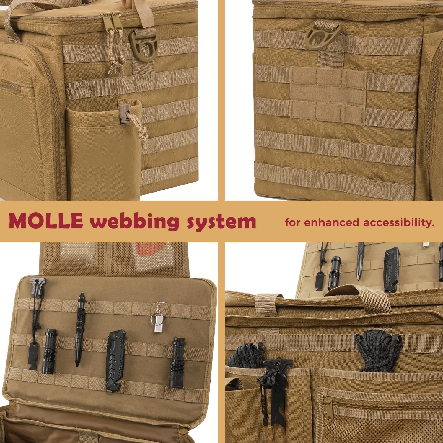 - Dedicated Work Area: Multiple compartments and pockets provide sufficient space for essentials such as tactical gear, notebooks, keys, sunglasses, gloves, ammunition and flashlights. Despite the capacity, the bag remains compact and portable, with a durable structure ensuring secure storage and easy access. Its rugged build, sturdy zippers, and thoughtful design ensure durability and practical organization.
