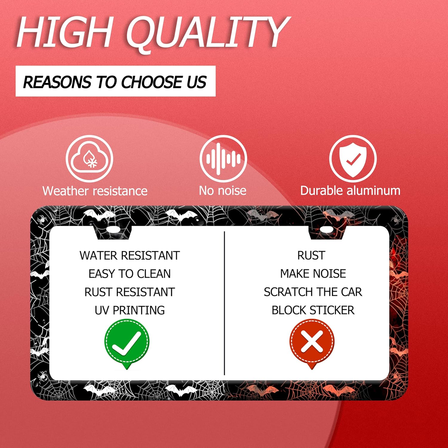 Bat Spider Web License Plate Frame Funny Gothic License Plate Frames Stainless Steel Accessories Cars Decor with 2 Holes and Screws Fits Standard Us Ca Vehicles License Plate Holder 12.2 X 6 Inch