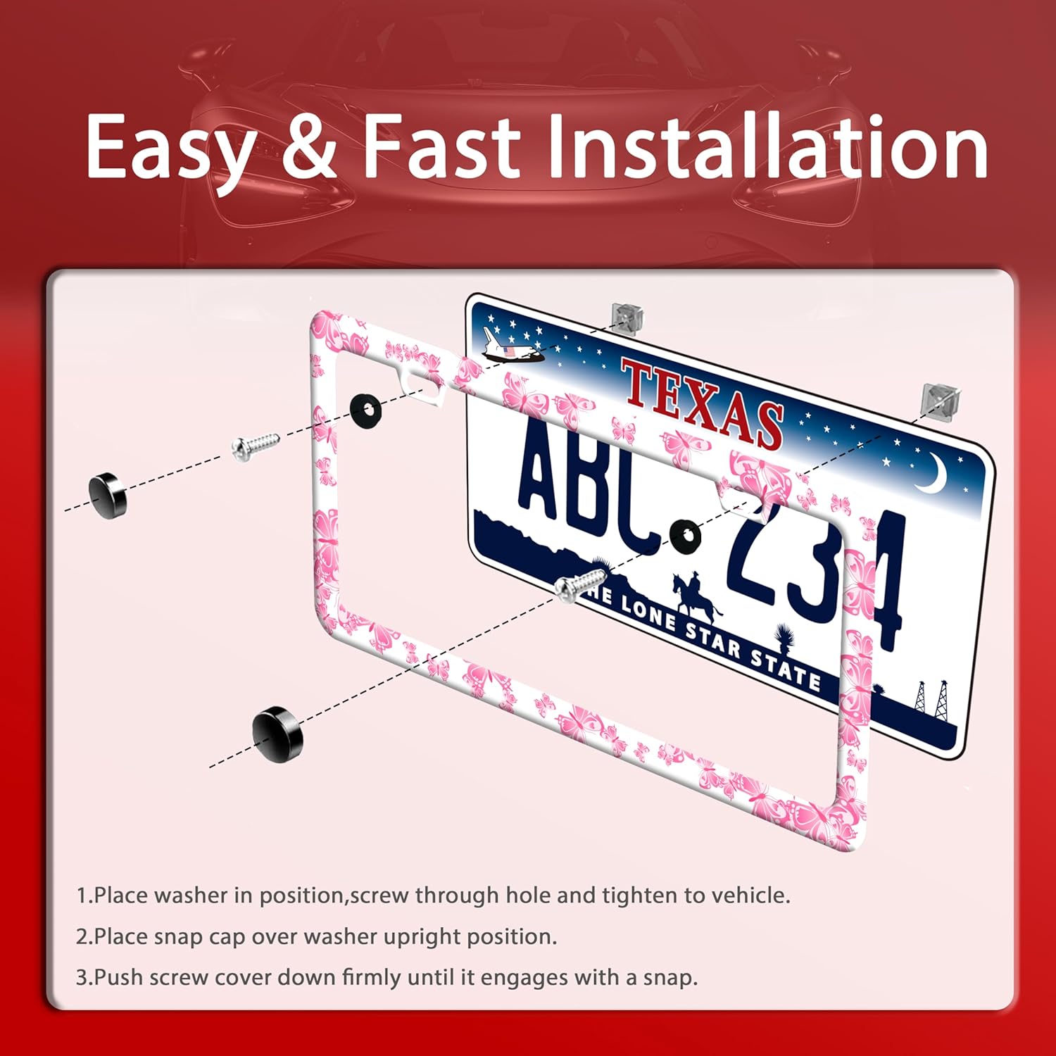 Pink Butterfly License Plate Frame Funny Animal License Plate Frames Stainless Steel Accessories Cars Decor with 2 Holes and Screws Fits Standard Us Ca Vehicles License Plate Holder 12.2 X 6 Inch