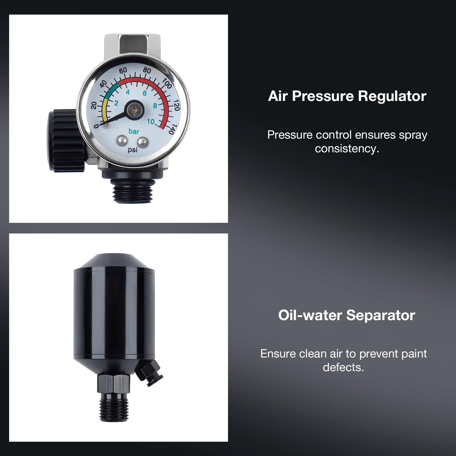 - Complete Kit & Lifetime Warranty: Includes HVLP auto paint gun, 3 nozzles (1.4/1.7/2.0mm), air pressure regulator, oil-water separator, 10 disposable paint cups with lids, 1 hard cups, 5 plugs, paint cup adaptor, 600cc cup, cleaning kit, PTFE tape, 10 flters cone and wrench so youβre ready to paint out of the box. Backed by a lifetime warranty for long-term reliability.