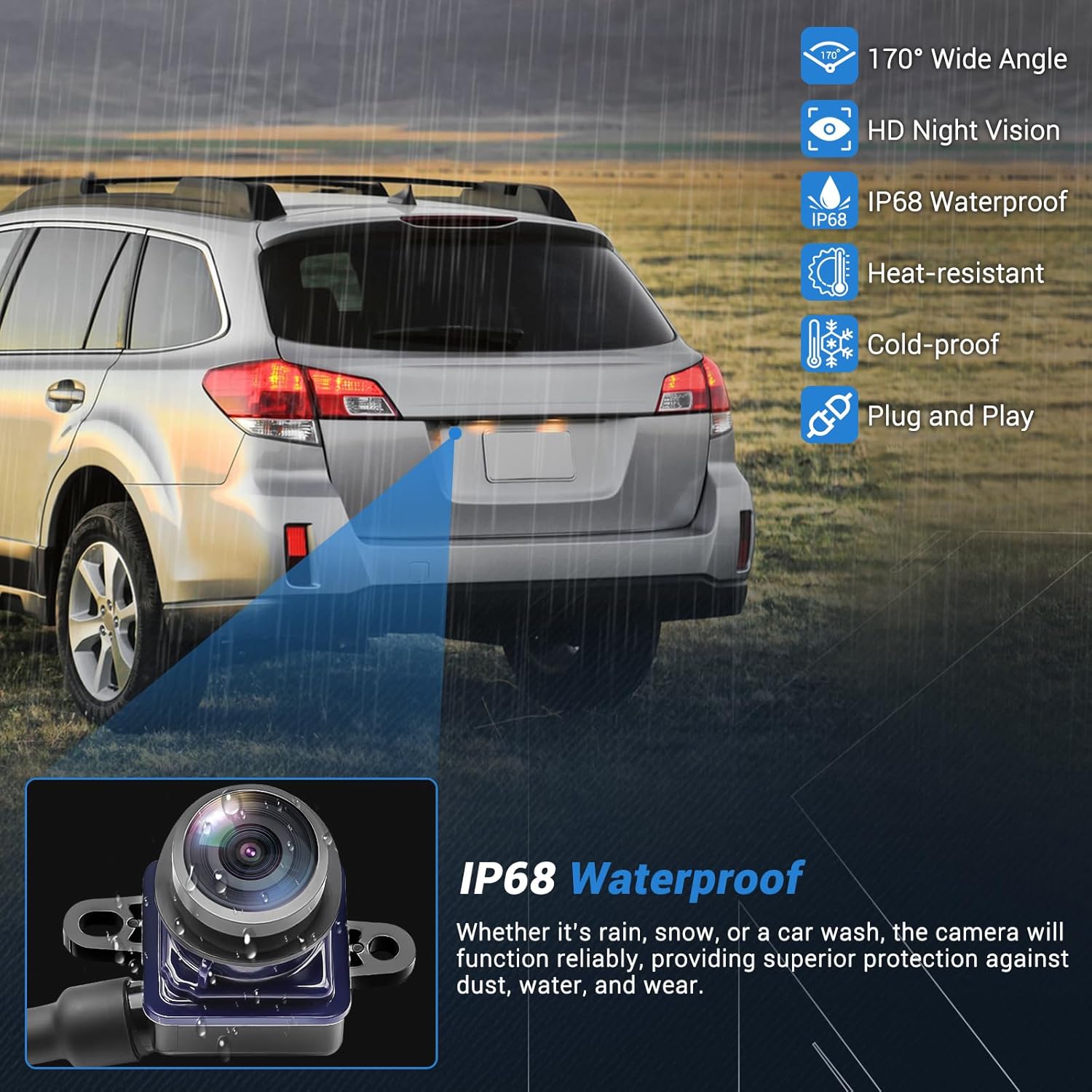 - IP68 Waterproof: With an IP68 rating, this Rear View Backup Camera is designed to withstand harsh weather conditions, including heavy rain and car washes. Featuring a durable, high-quality housing, it resists wear, high temperatures, and deformation for long-lasting performance.