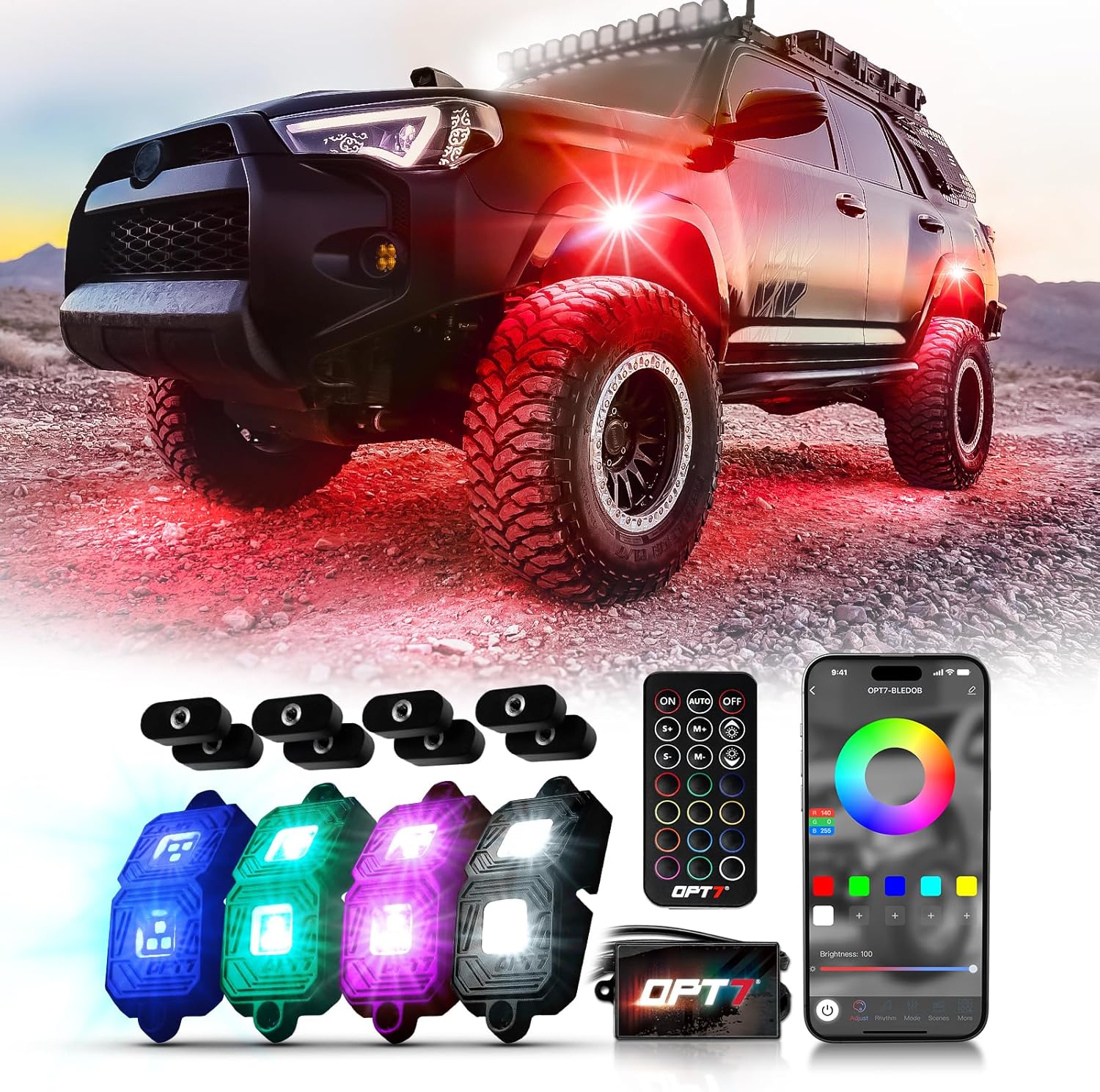 - [2 CONTROL METHODS] Elevate your vehicle’s vibe with customizable LED rock lights! Choose from endless static RGB colors, modes, and adjust speed, flashing, and brightness—all through the app or remote control. Easily switch your lights on/off to enhance your vehicle's style and add a bold, adventurous touch. Simply scan the QR code on the control box or user manual to download the OPT7 GLOW app (iOS & Android). Get ready to light up your adventures like never before!