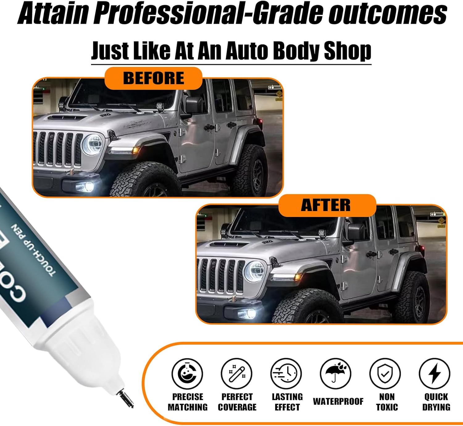 - ăExcellent Color MatchăThe car touch-up paint is specially designed for the Jeep vehicles and can be well-matched with the Jeep. It is meticulously crafted to minimize color differences and make scratches invisible, Our touch up paint compatible with Jeep features an exact color match for any Jeep model, ensuring a seamless and professional finish. No more worrying about mismatched shades